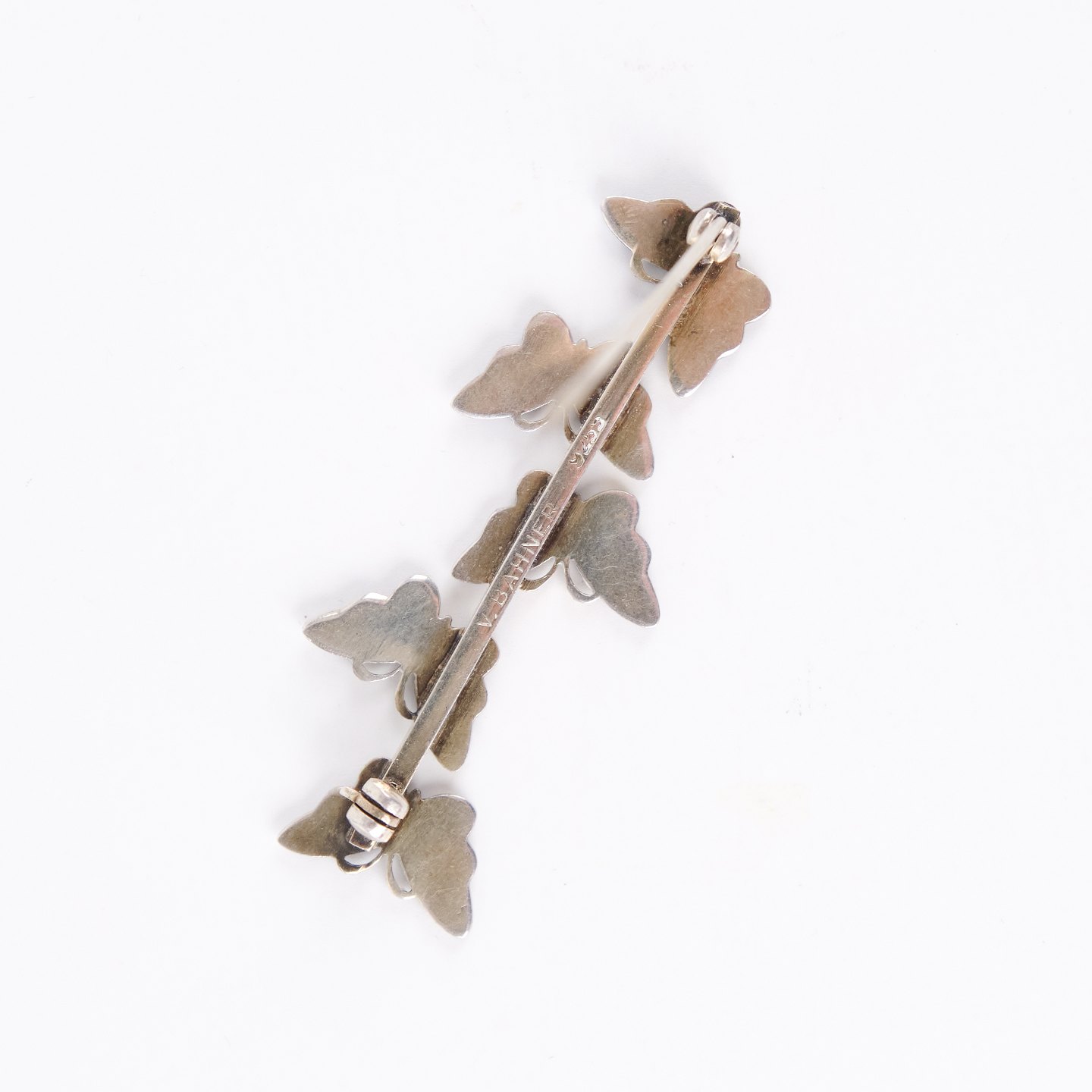 Brooch featuring blue enamel butterfly motifs, stamped 925 S and crafted by Volmer Bahner & Co., Copenhagen (1962–1987). A characteristic piece of Danish jewellery with detailed enamel work and the distinctive style of a renowned maker. Enamel fully intact.— Manufacturer: Volmer Bahner & Co.