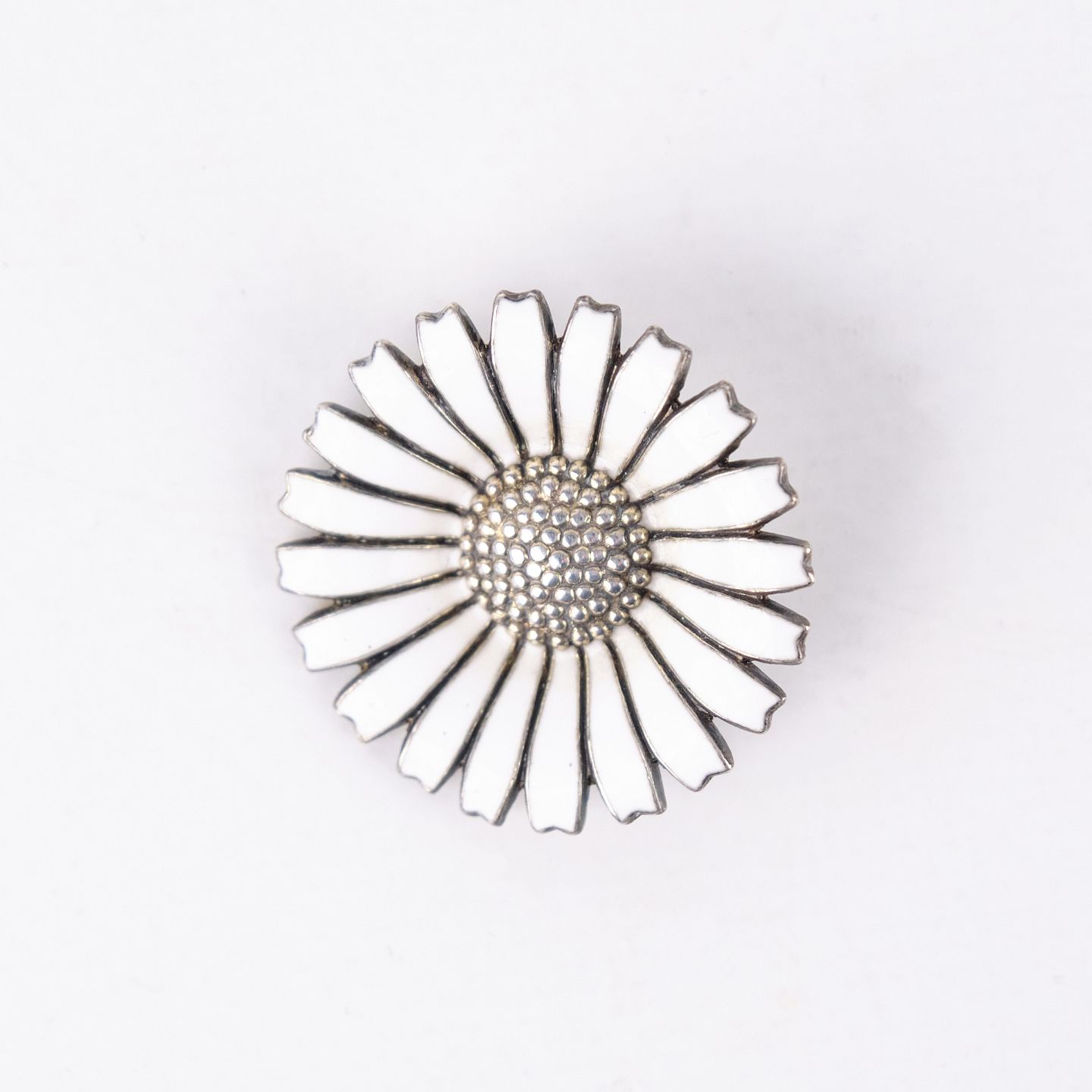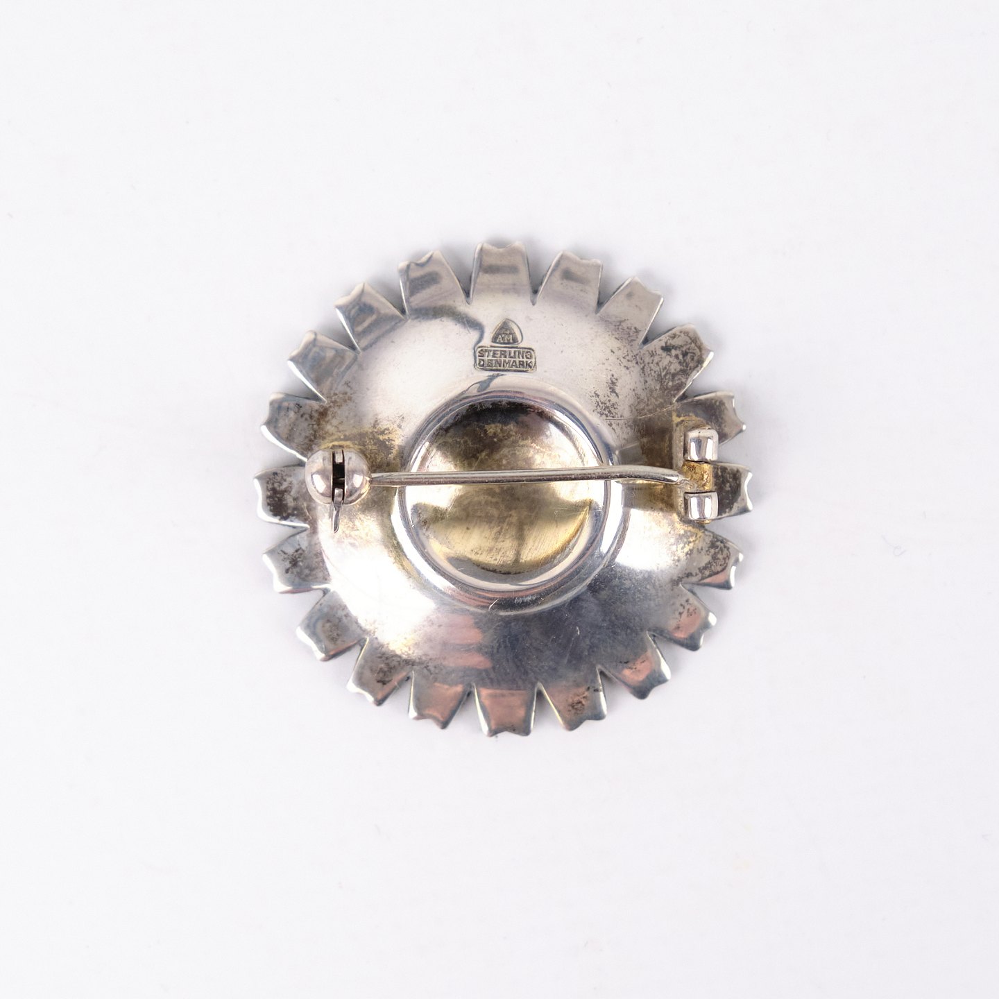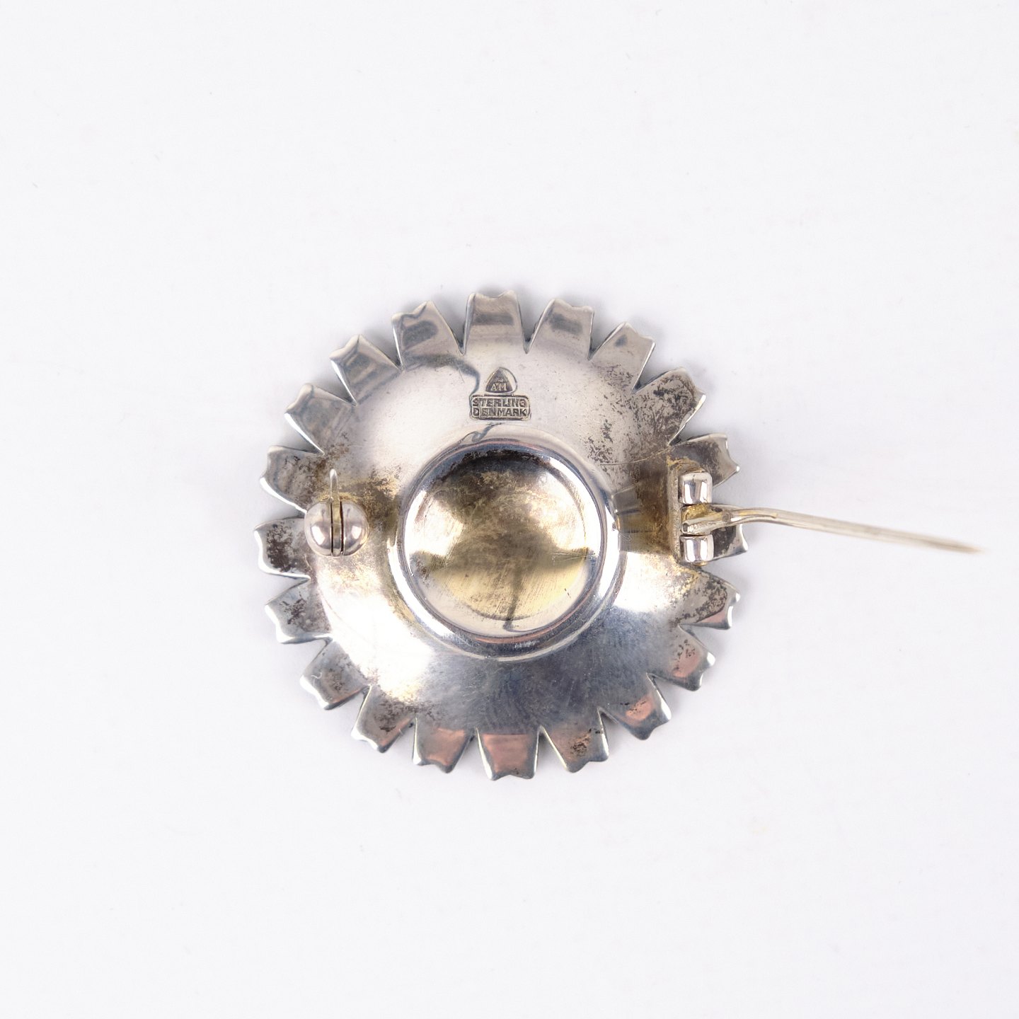 Brooch by Anton Michelsen from the 1940s, marked AM Sterling Denmark and gilded. The enamel is fully intact, and the piece features classic craftsmanship and elegant period design. A fine collectible from a renowned Danish silversmith.— Period: 1940s
