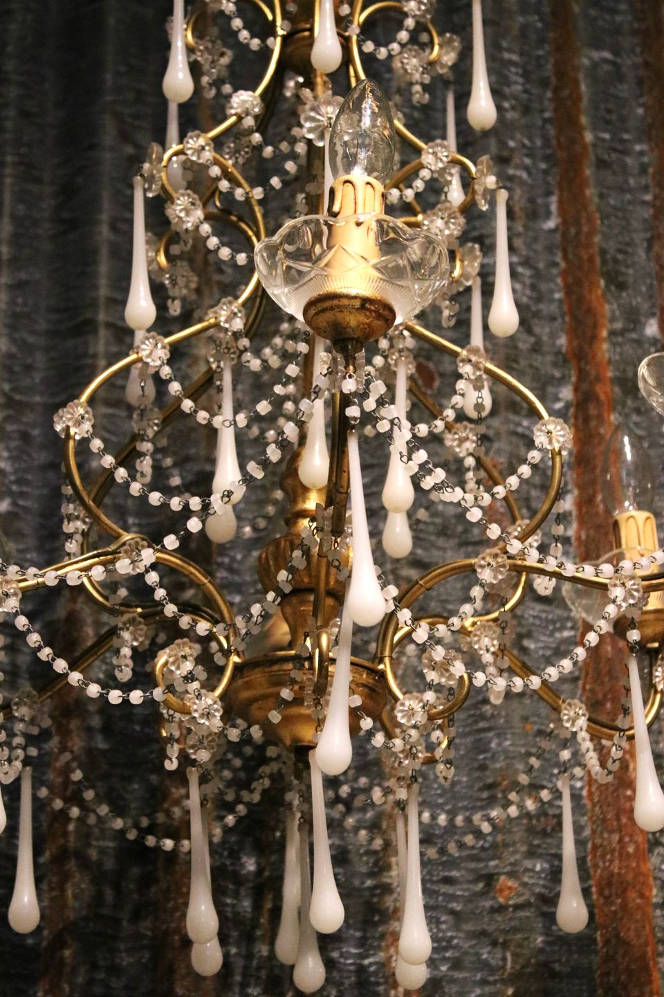 We offer a wide selection of old furniture with character, prism chandeliers and French church candlesticks.
