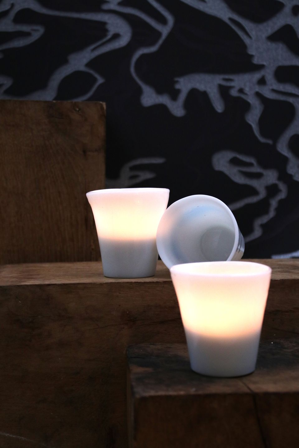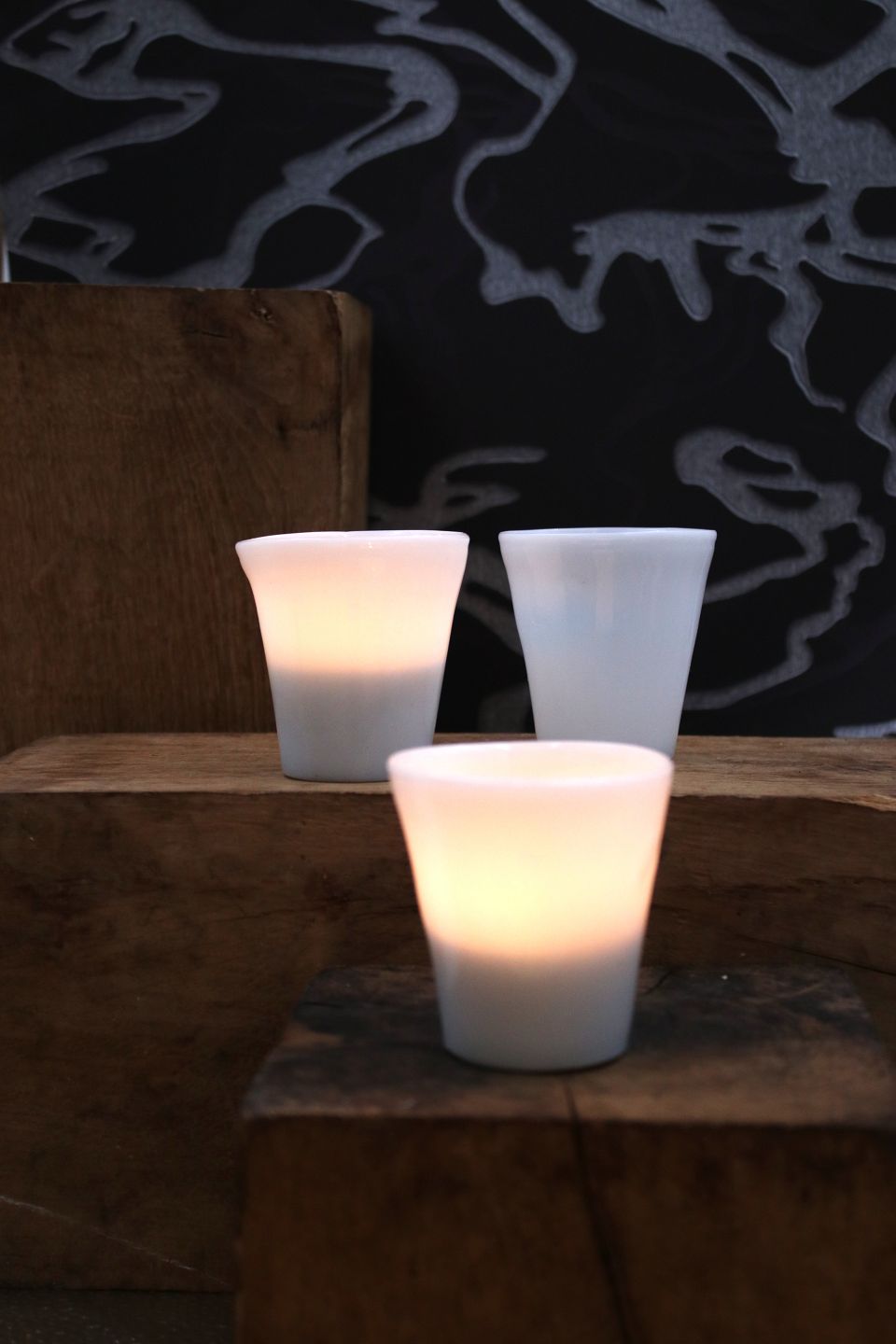 Old mouth-blown candle glass in white opal glass for tealights.H: 6.5cm. Dia.: 6.5cm. ( 3 pieces in stock )Item number: Lys glas