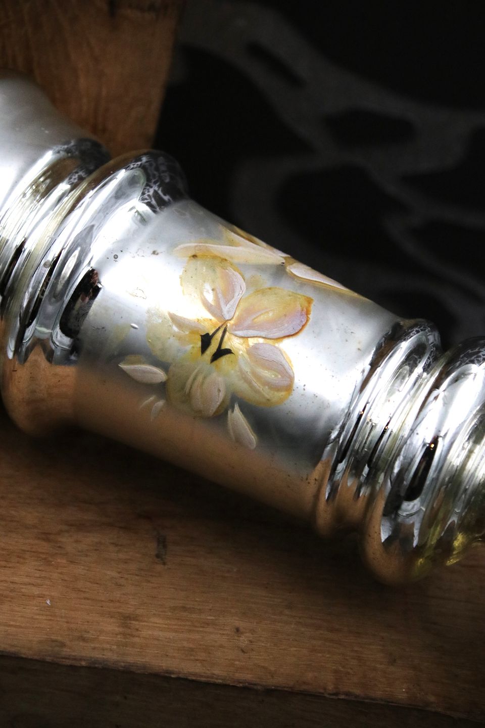 Vase in 19th century Mercury Glass with finely decorated floral motif.H: 22cm. Dia.: 10cm.
