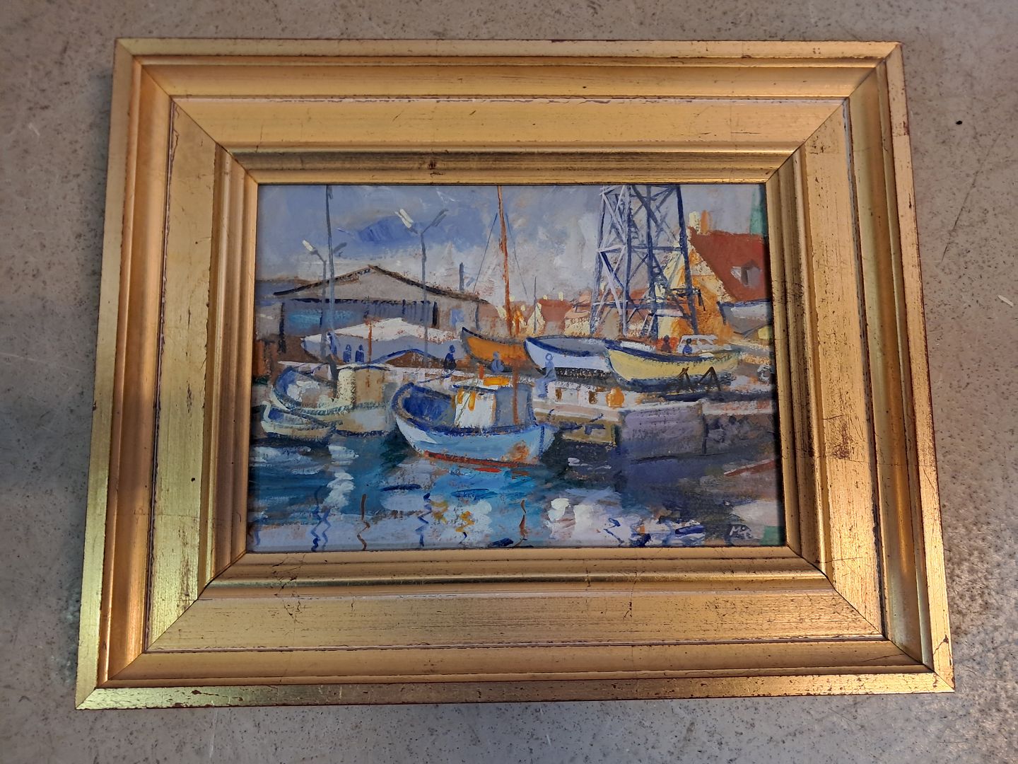 Maleri af Dragør Havn i guldmalet ramme, af : Mogens Amdi Thorsen (1924-2016)Det har brugsspor.
