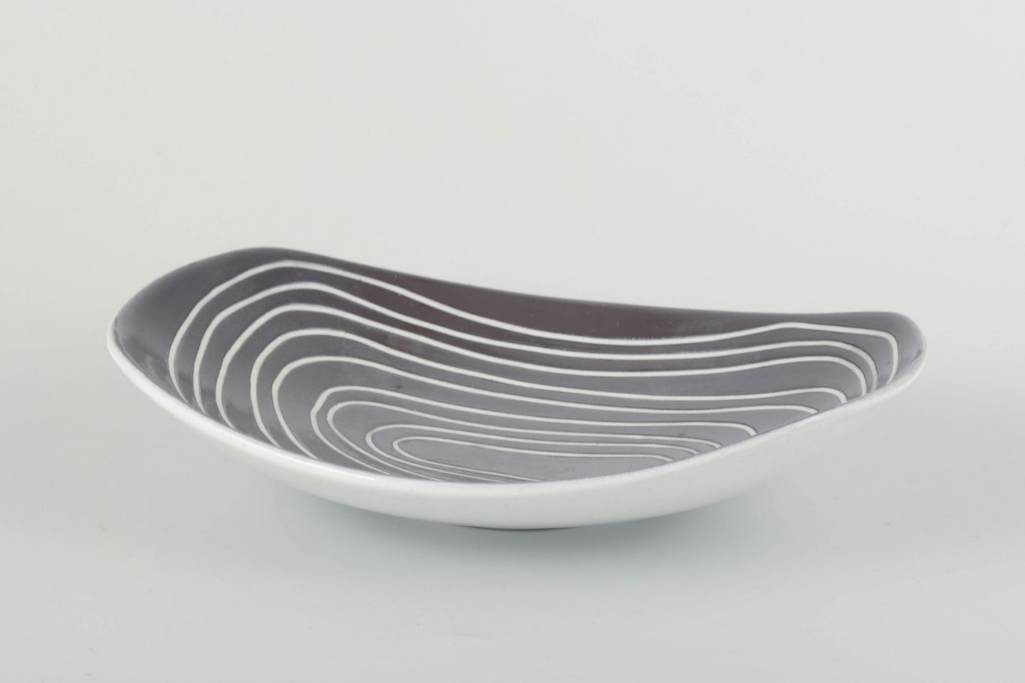 Asymmetrisk formet skål i fajance med hvid glasur udvendigt og mørkgrå glasur med hvide linjer indvendigt.