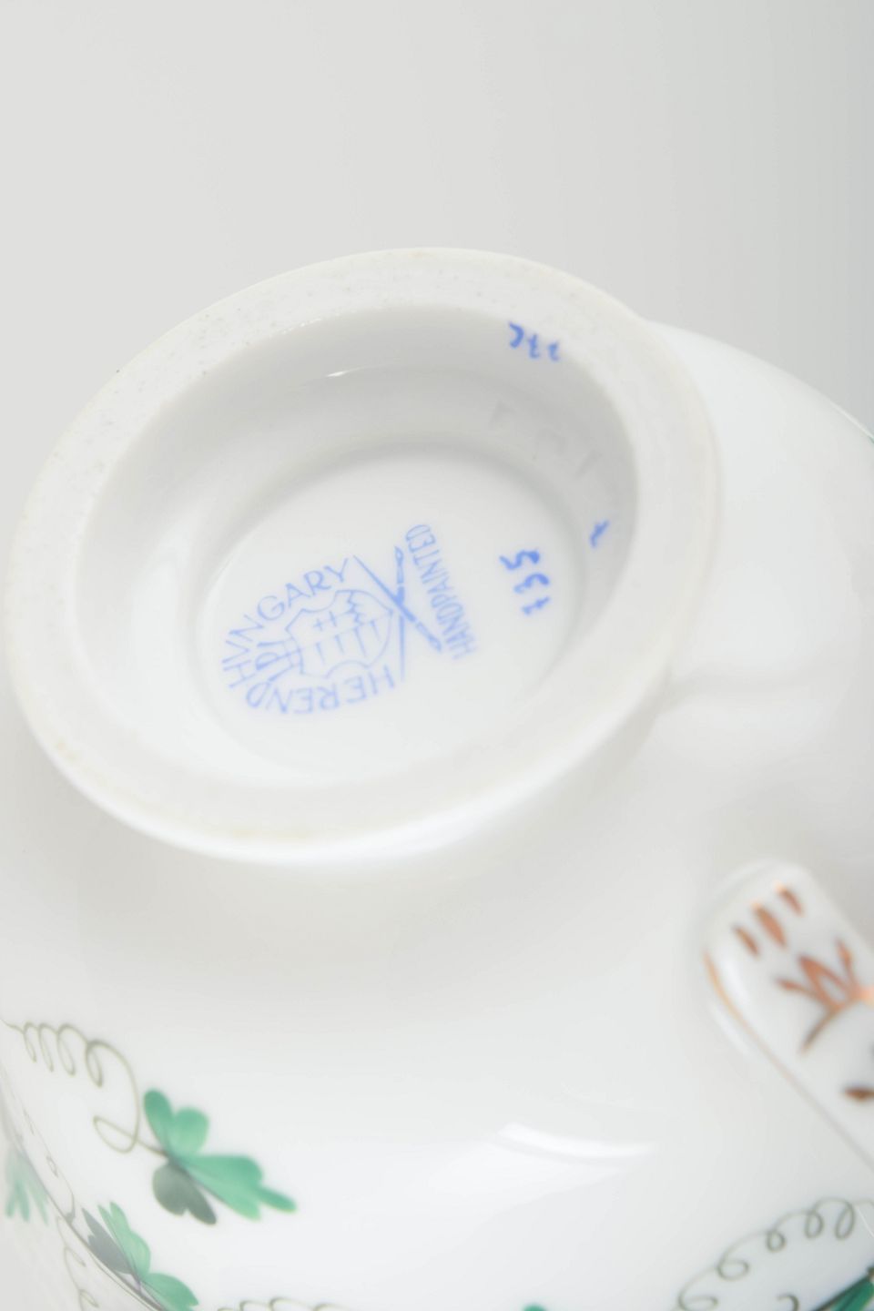 Elegant porcelain set with hand-painted green floral garlands and gilded rims. A classic Herend design featuring refined detailing and gently curved forms.