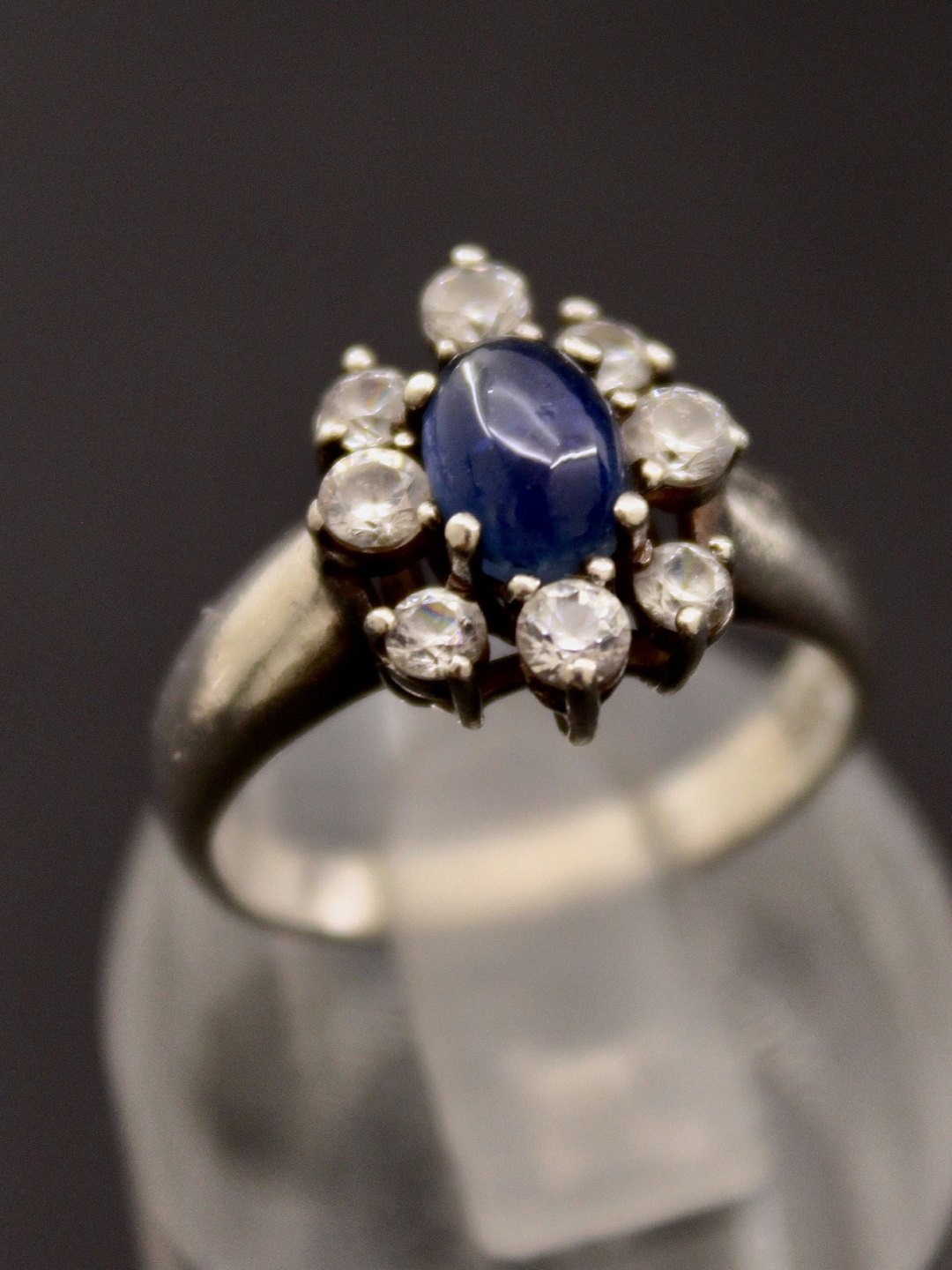 Sterling silver ring size 52 with cabochon cut sapphire surrounded by clear stones item no. 623552 Dealer