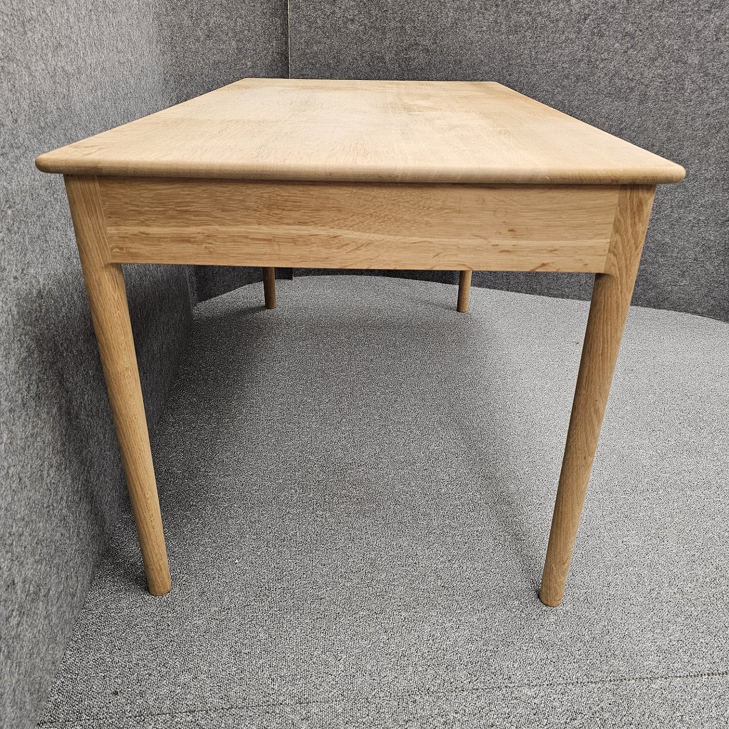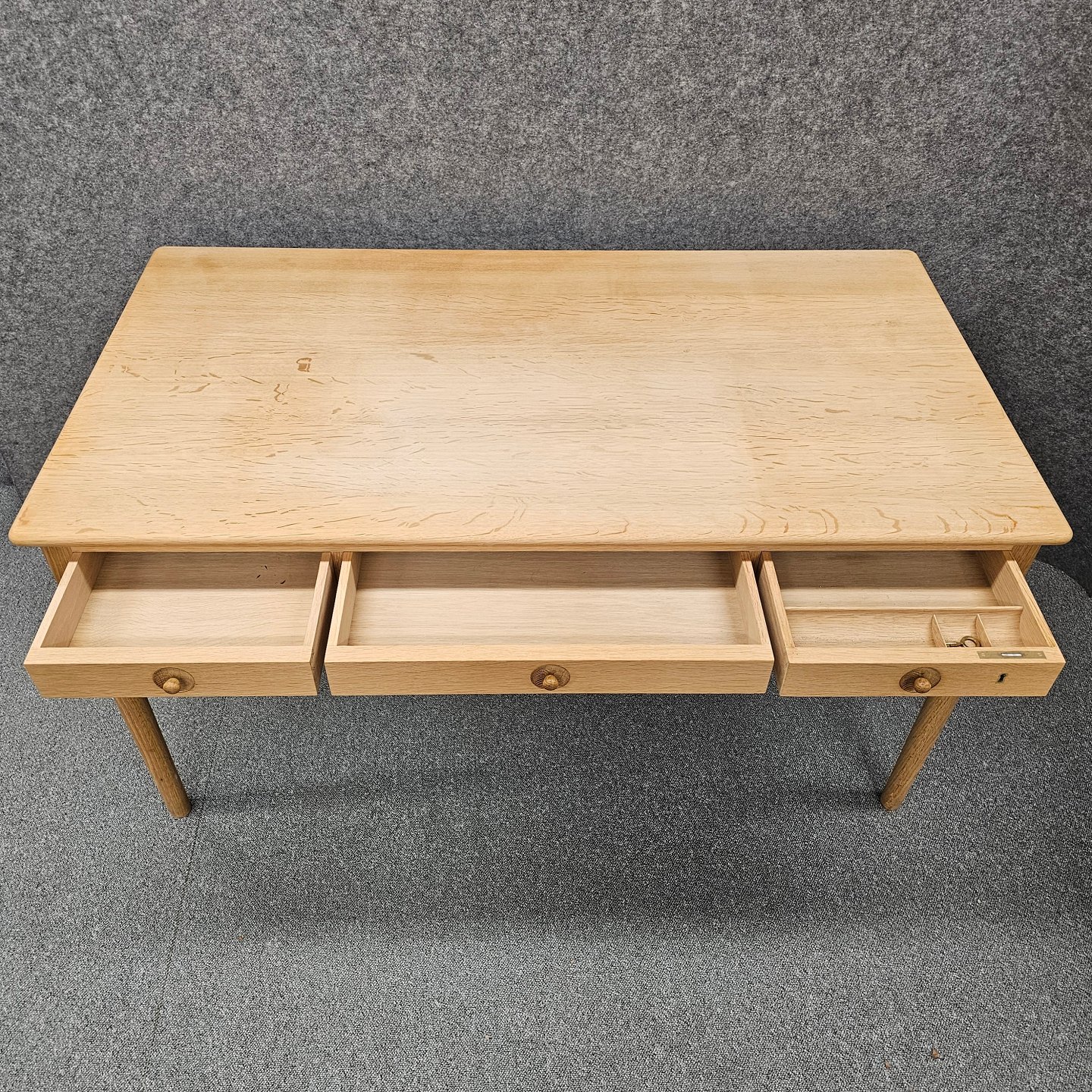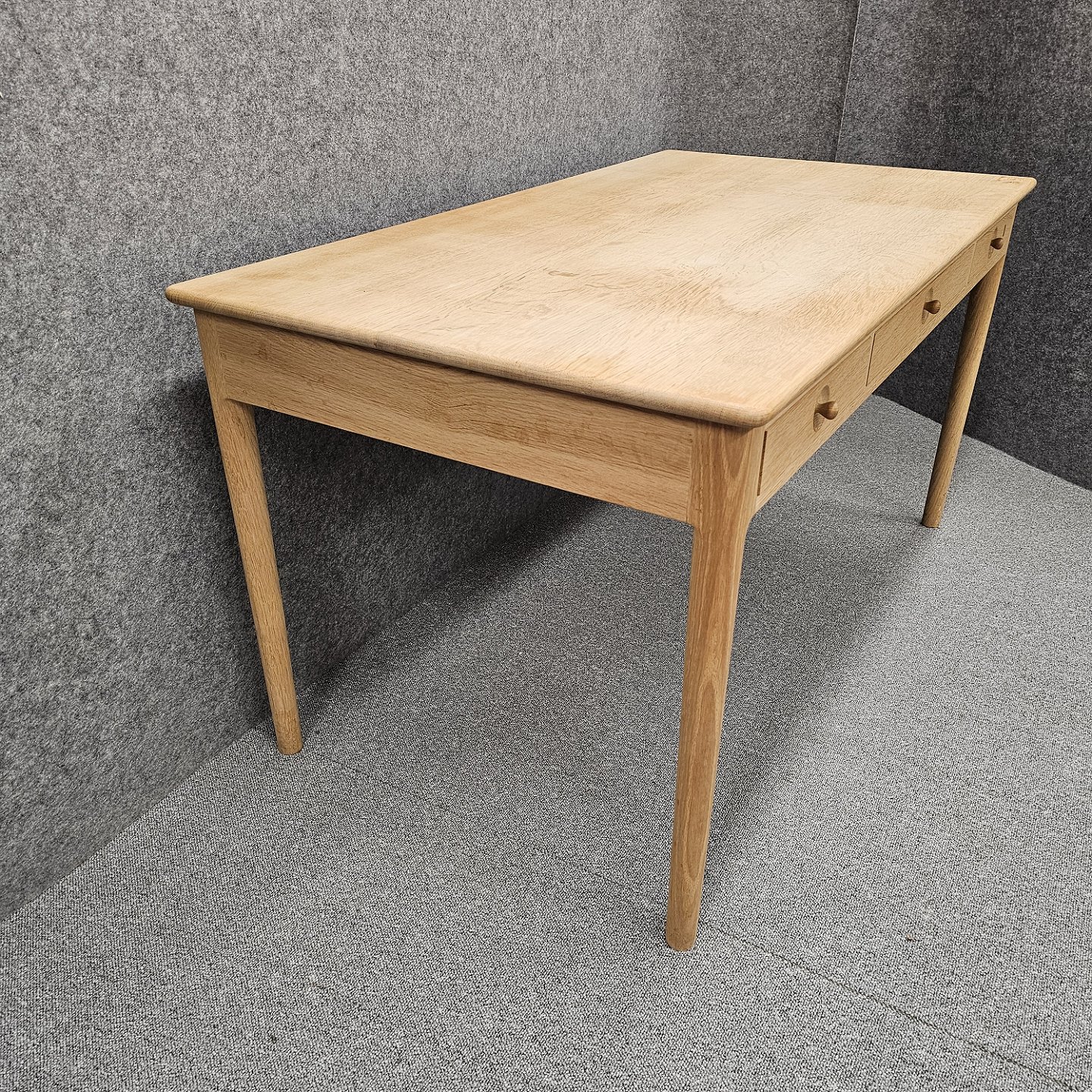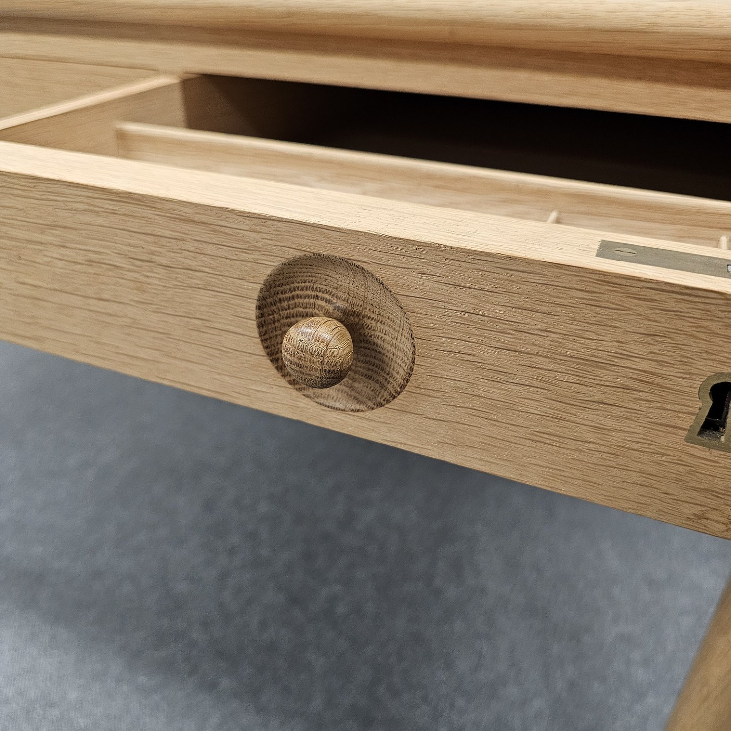 Fritstående skrivebord i egetræ med tre skuffer, højre skuffe har lås og medfølgende nøgleModel 305