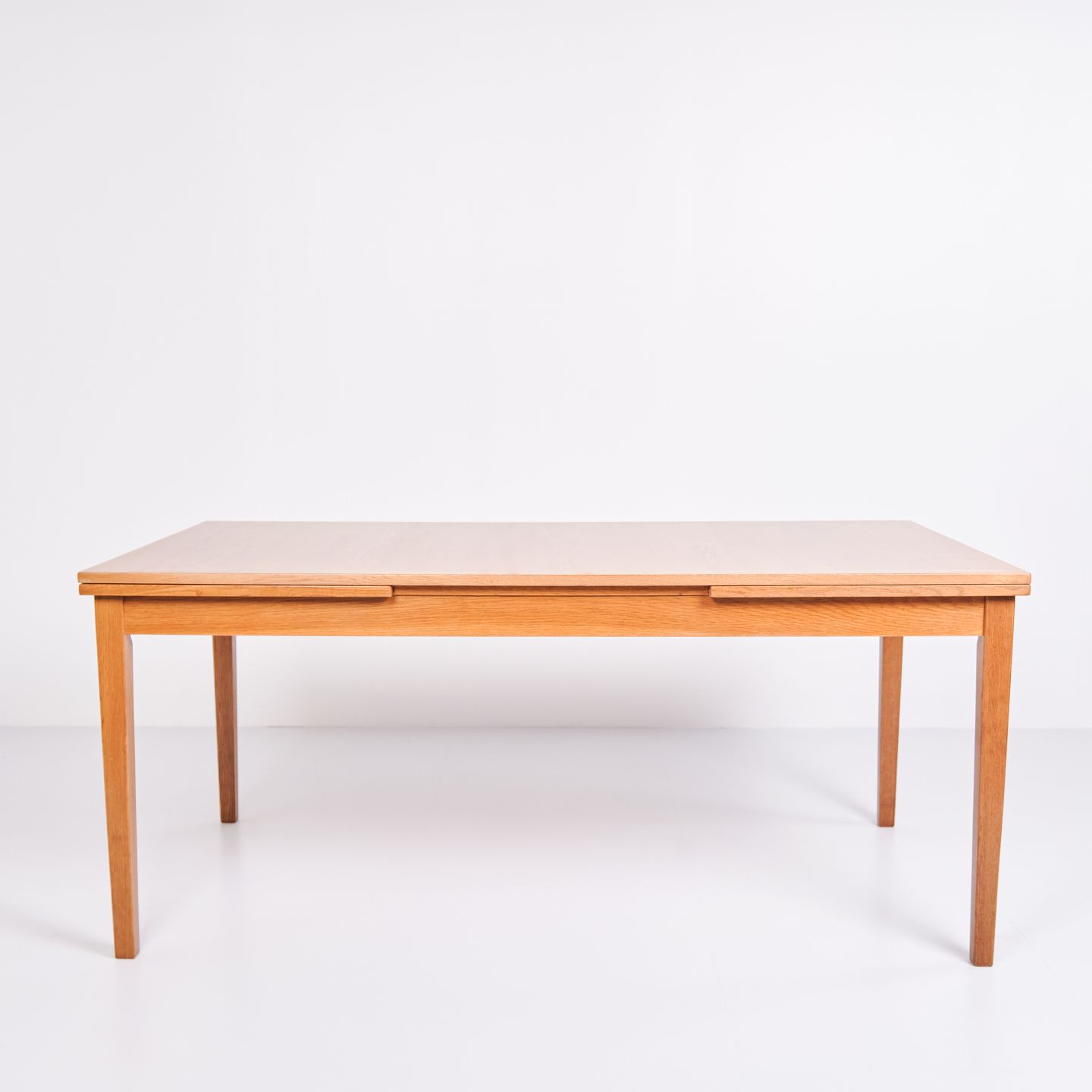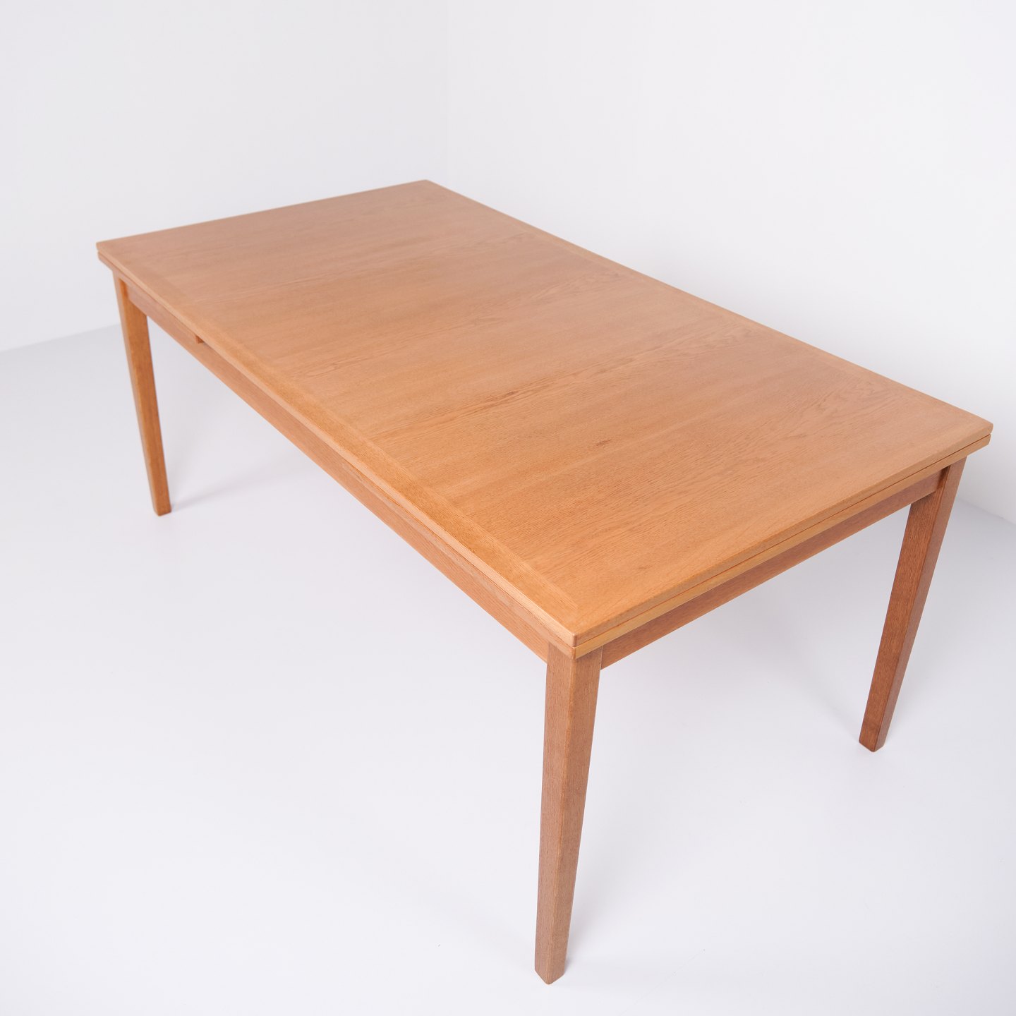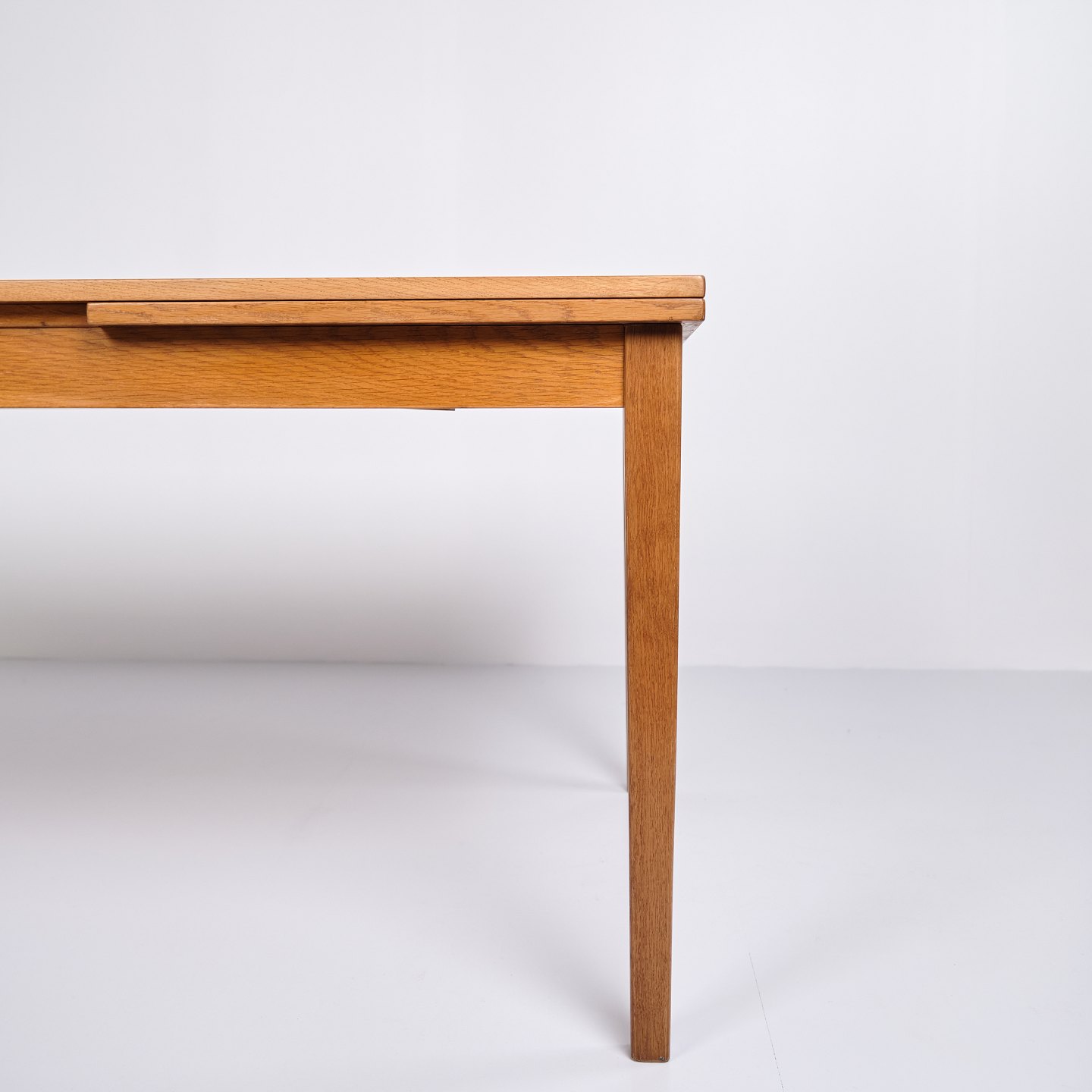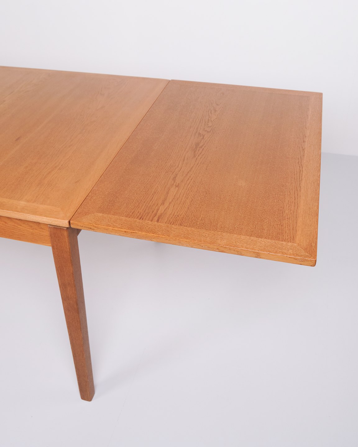 Kai Winding oak dining table from the 1960s. Slagelse Møbelfabrik. Pull-out with two leaves, 55 cm each.— Origin: Denmark