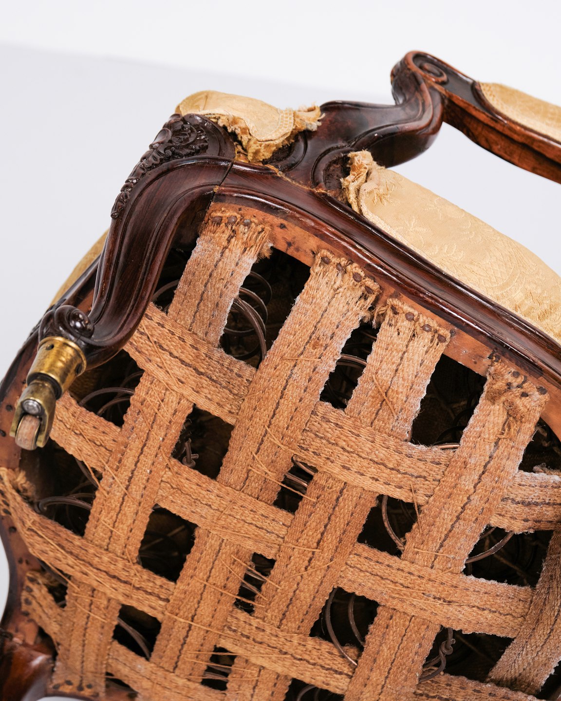 Antique armchair made of mahogany with carved details in the Rococo style, dated to around the 1890s. The seat and back are upholstered with floral upholstery.— Origin: Denmark / Europe