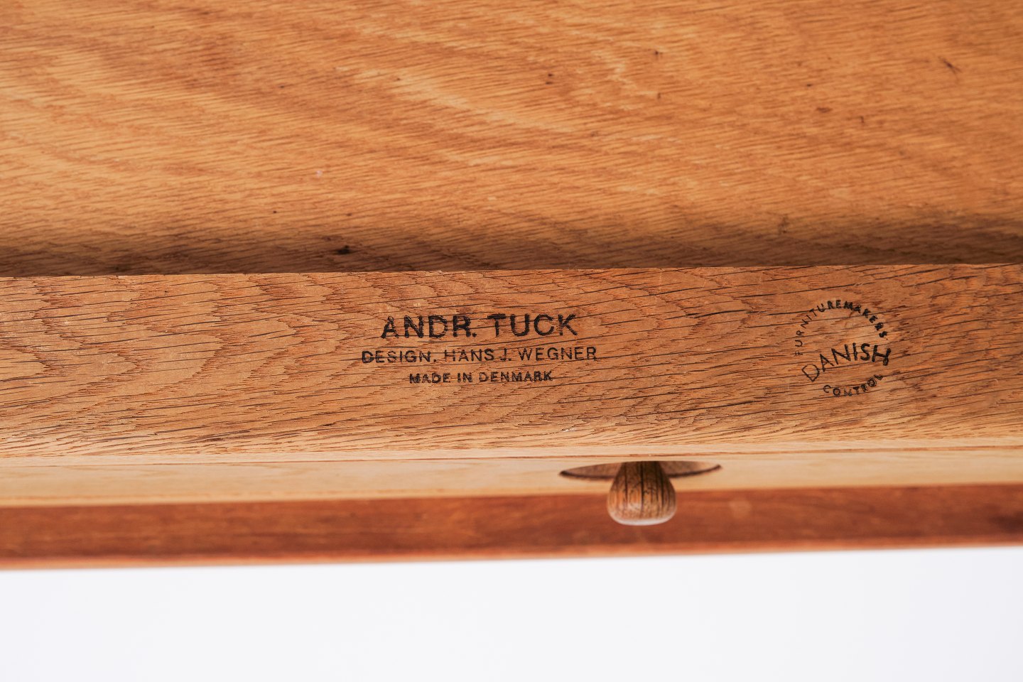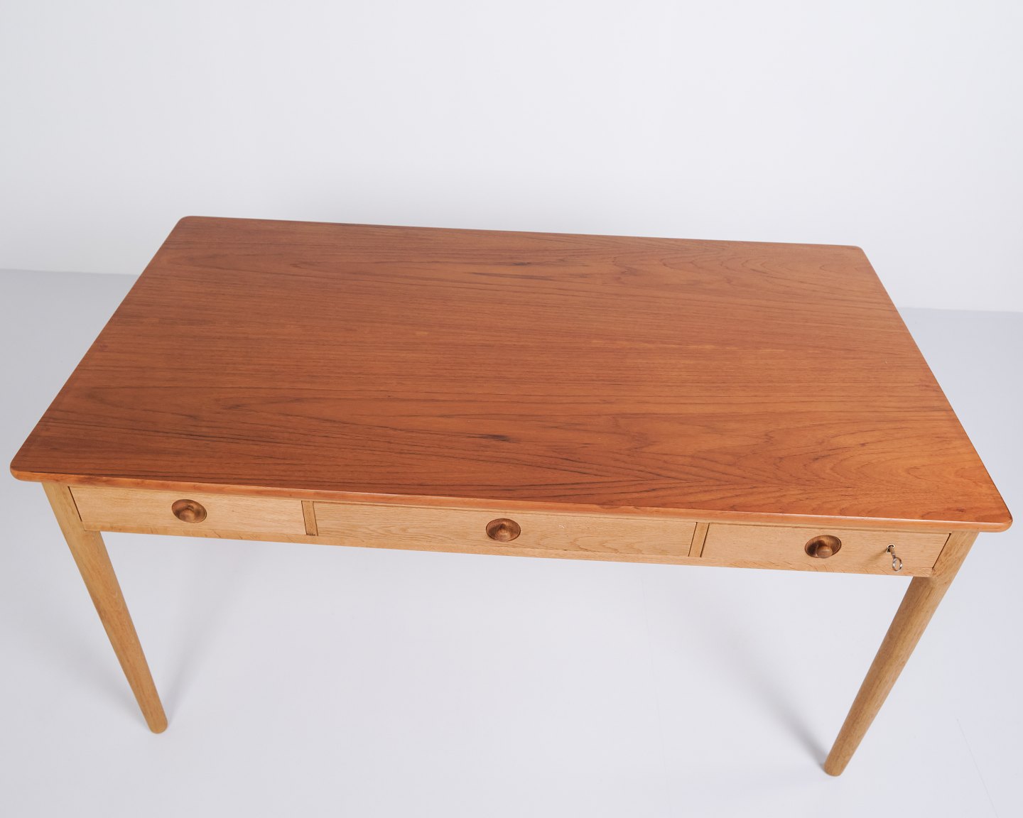 Desk designed by Hans J. Wegner and produced by Andreas Tuck in the 1960s. The table is made of teak with oak leg construction – a classic material combination that highlights Wegner’s sense of proportion and natural balance. The table has drawers in the front.— Origin: Denmark