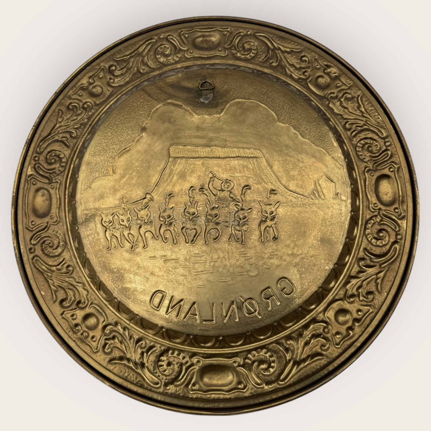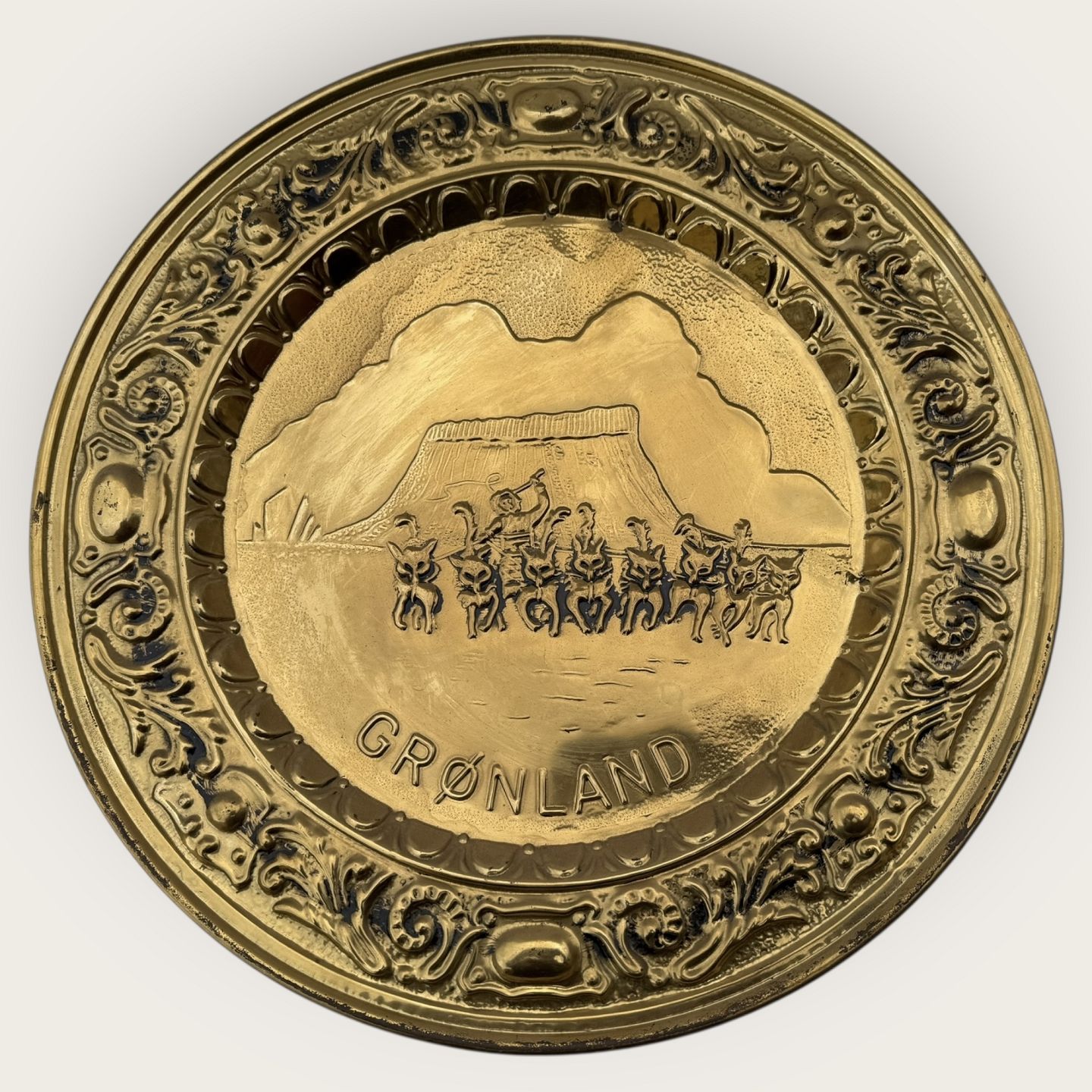 Brass dish, Dog sled in Greenland, diameter 43cm, nice patinated condition.Stock: 1