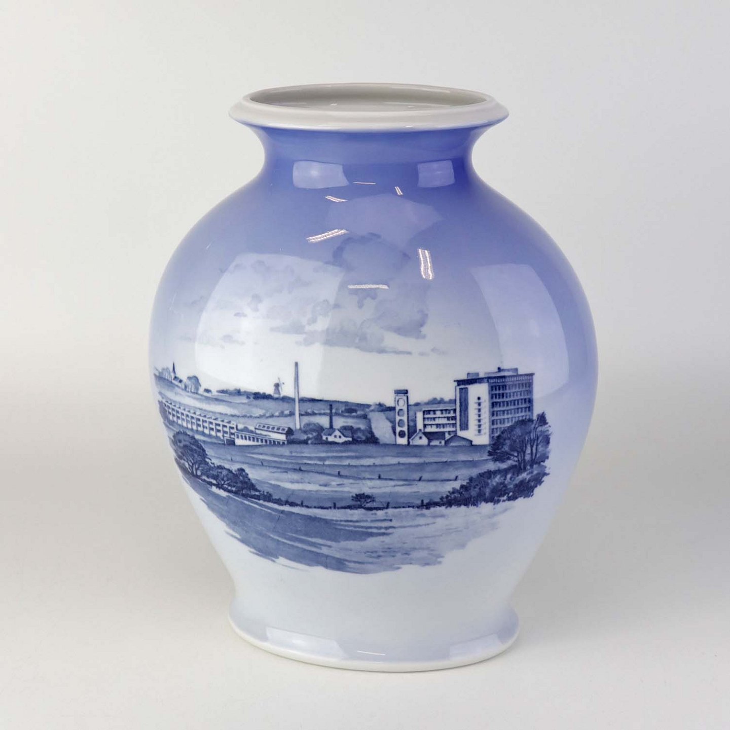 Oval jubilæumsvase i kongelig porcelæn med motiv af Danfoss fabriksbygninger. Nr. 3088Producent Royal Copenhagen