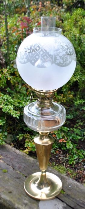 Kerosene lamp, circa 1880. Brass base, clear glass container with cuts and top dome in frosted glass with decorations. Height with burner: 63 cm.Excellent condition - appears freshly polished.