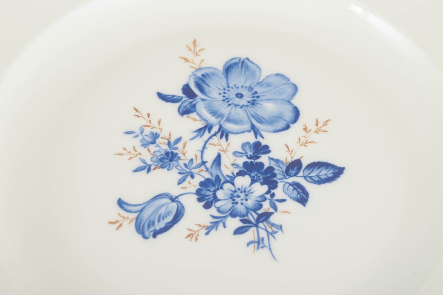 Hand-decorated porcelain with hand-painted blue floral motifs and gilt accents along the rim. Classic lightly scalloped form.
