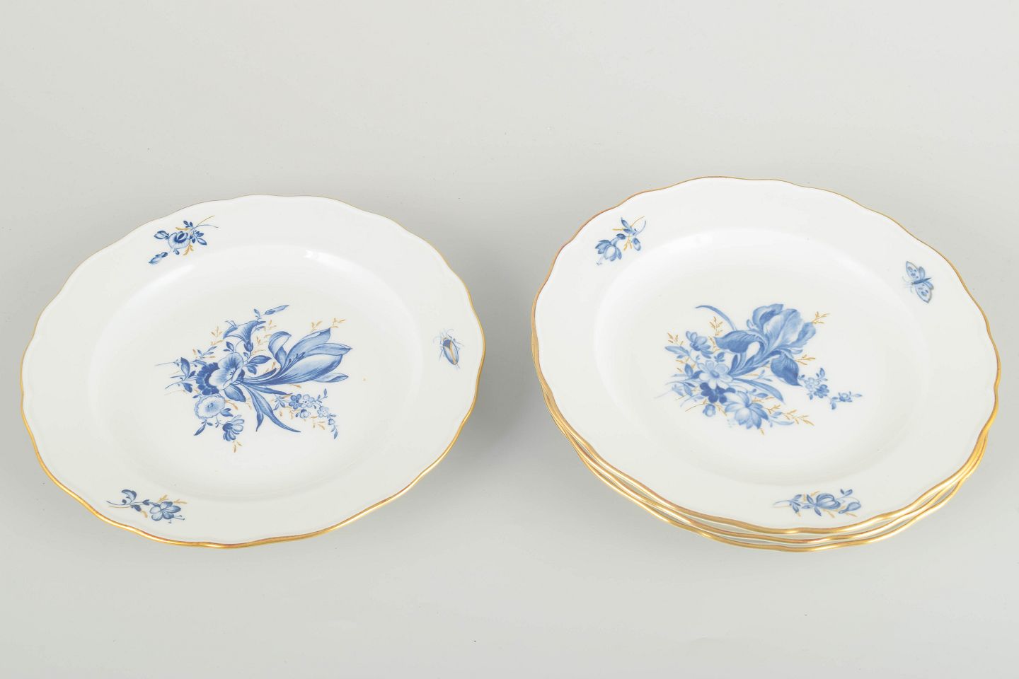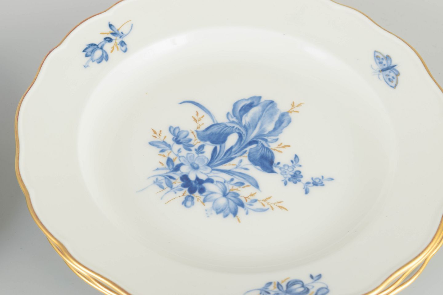 Hand-decorated porcelain with hand-painted blue floral motifs and gilt accents along the rim. Classic lightly scalloped form.