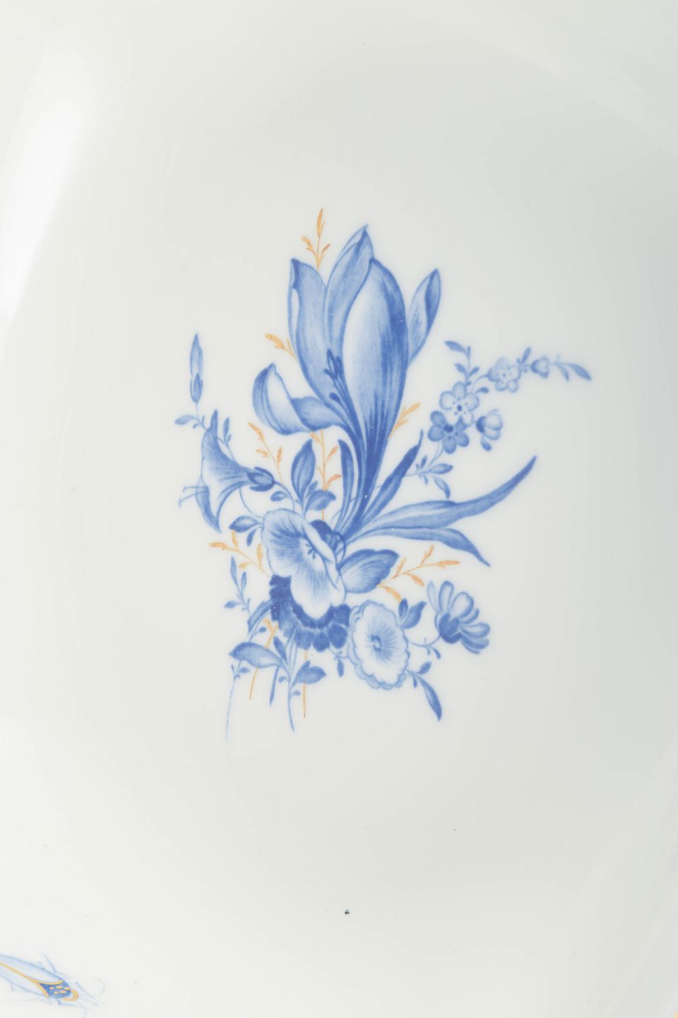 Hand-decorated porcelain with hand-painted blue floral motifs in classic Meissen style and gilt accents along the gently undulating rim. Elegant baroque-inspired form.
