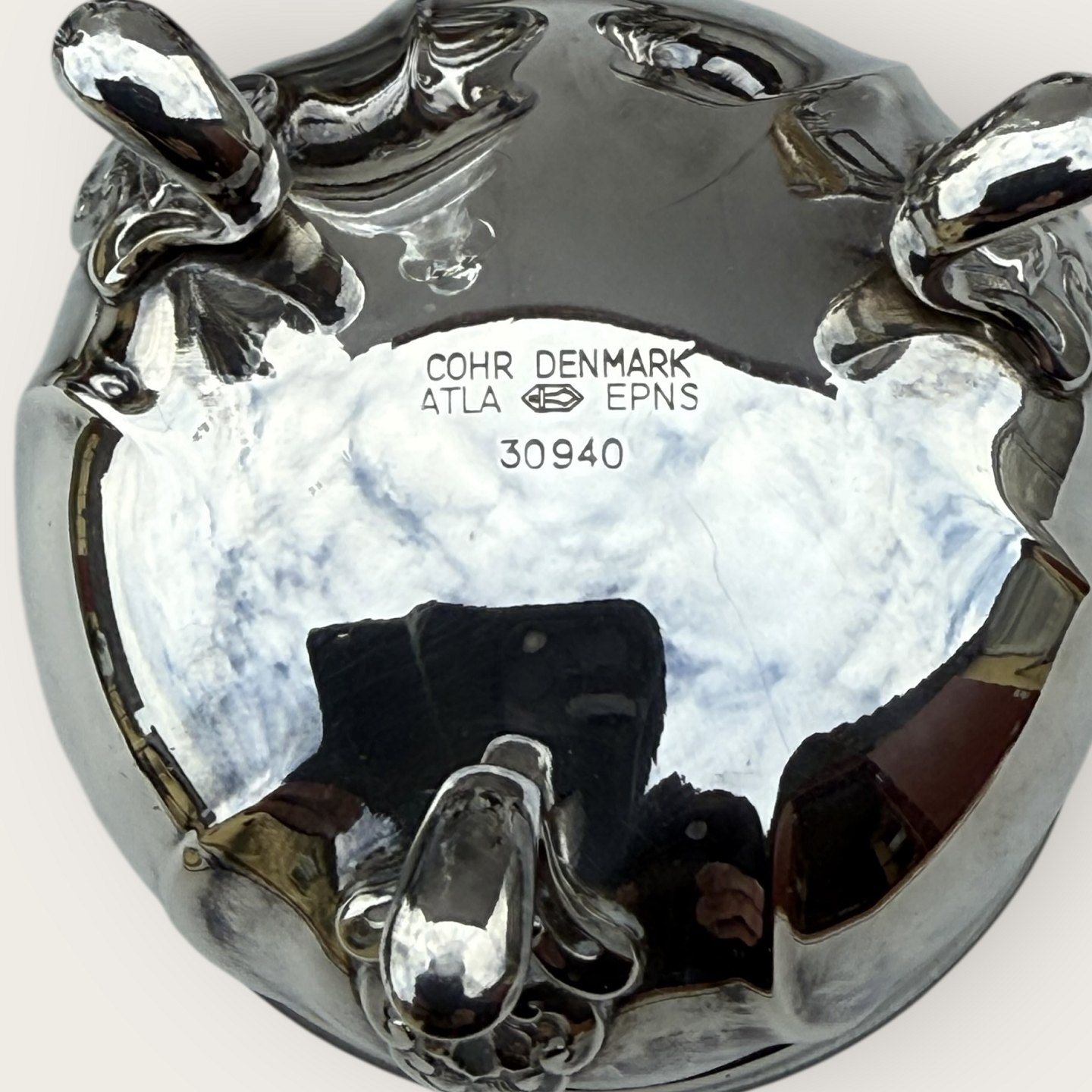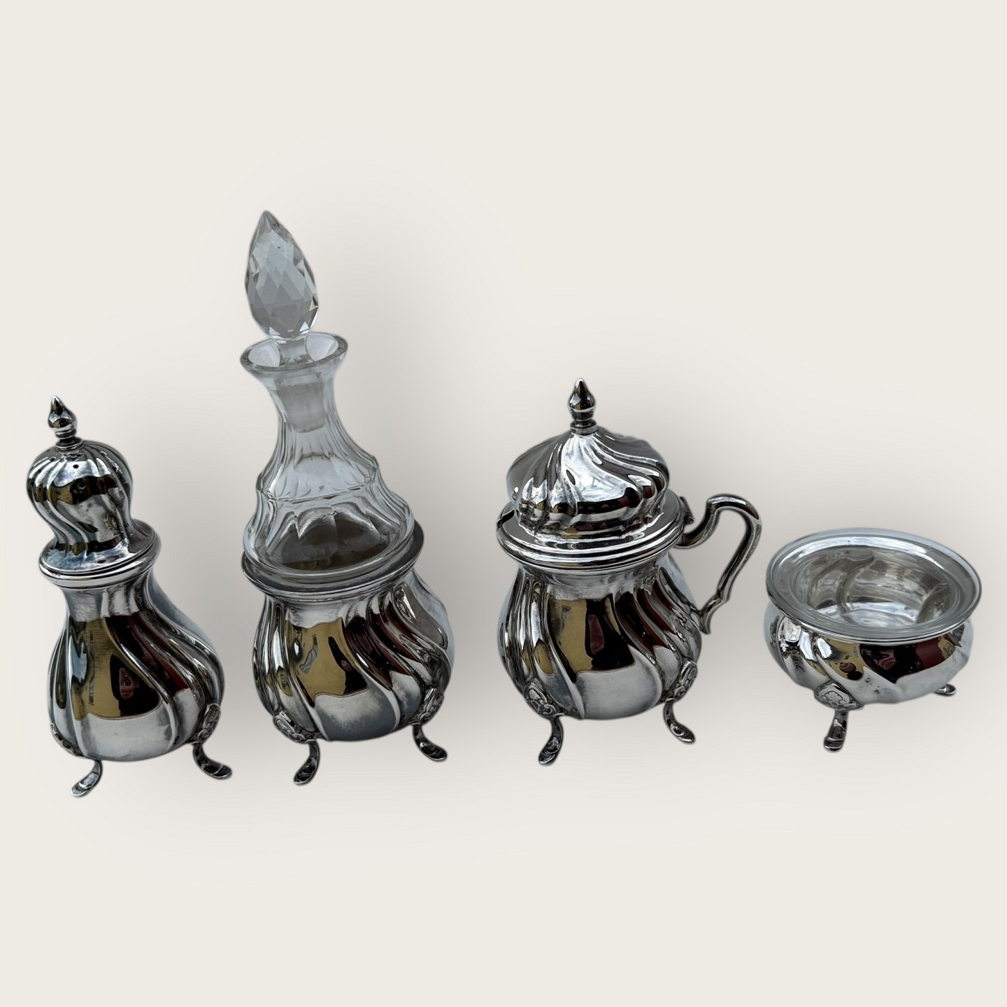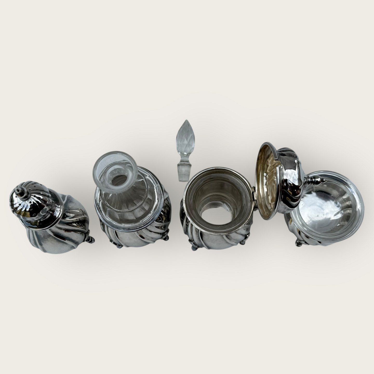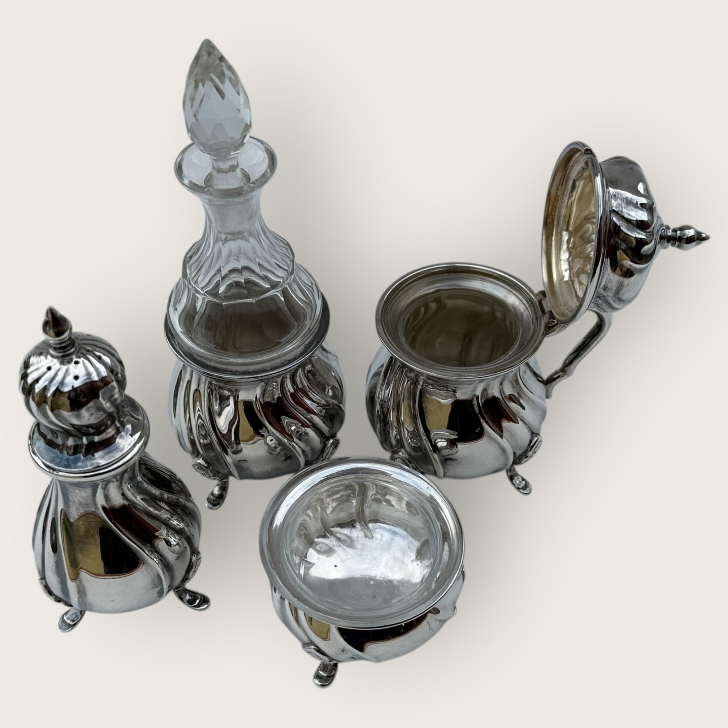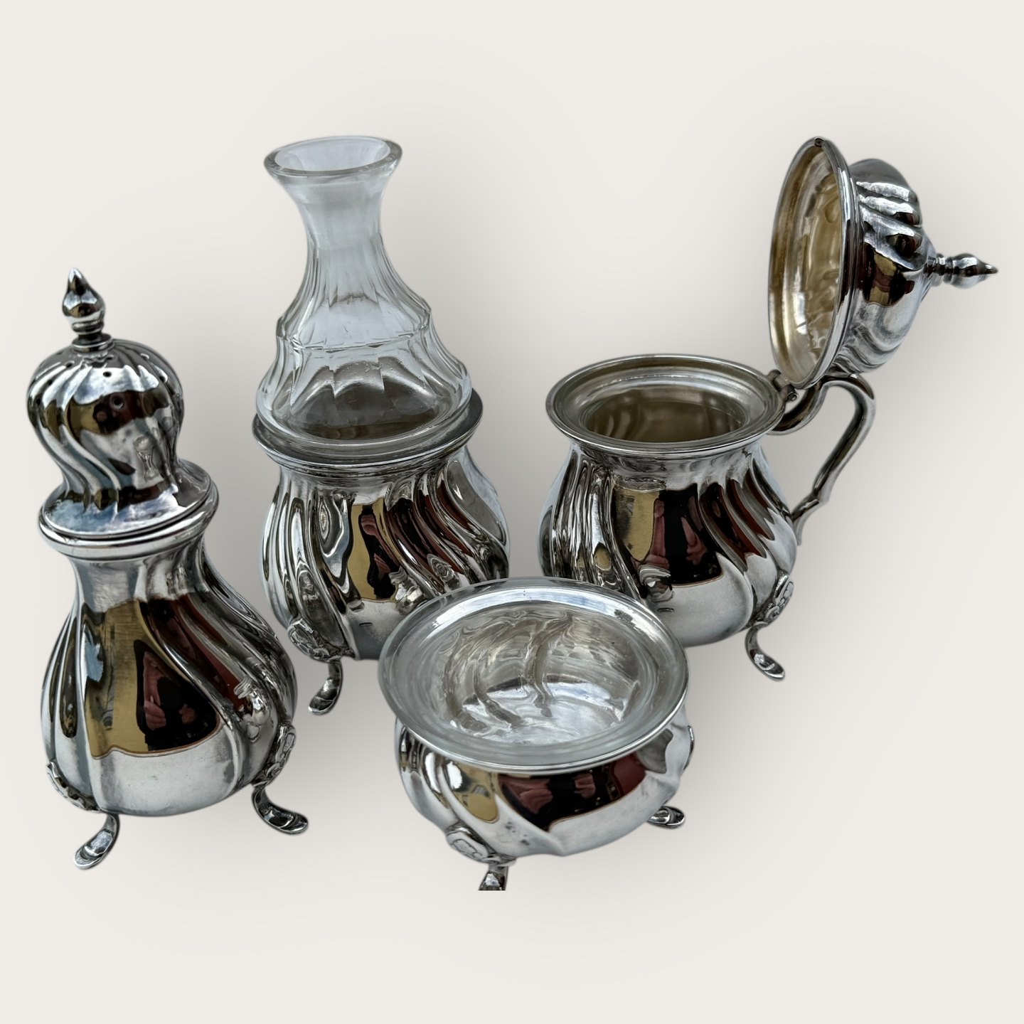 Cohr silverware factory, Plat de Menage, 4 parts, salt shaker with glass insert, mustard jar also with fine glass insert and bottle / carafe in fine condition (height 15.5cm), Salt shaker diameter 6cm, mustard jar 11cm high, Pepper shaker 12cm highStock: 1