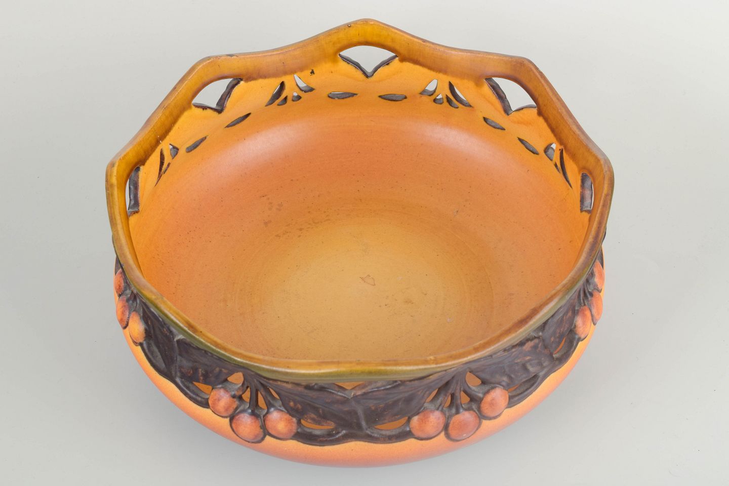 Art Deco-/sen Art Nouveau-inspireret skål i glaseret keramik med gennembrudt bort og plastisk modelleret dekor af kirsebær og blade i brune og grønne nuancer. Mat orange grundglasur med blød toning mod bunden.