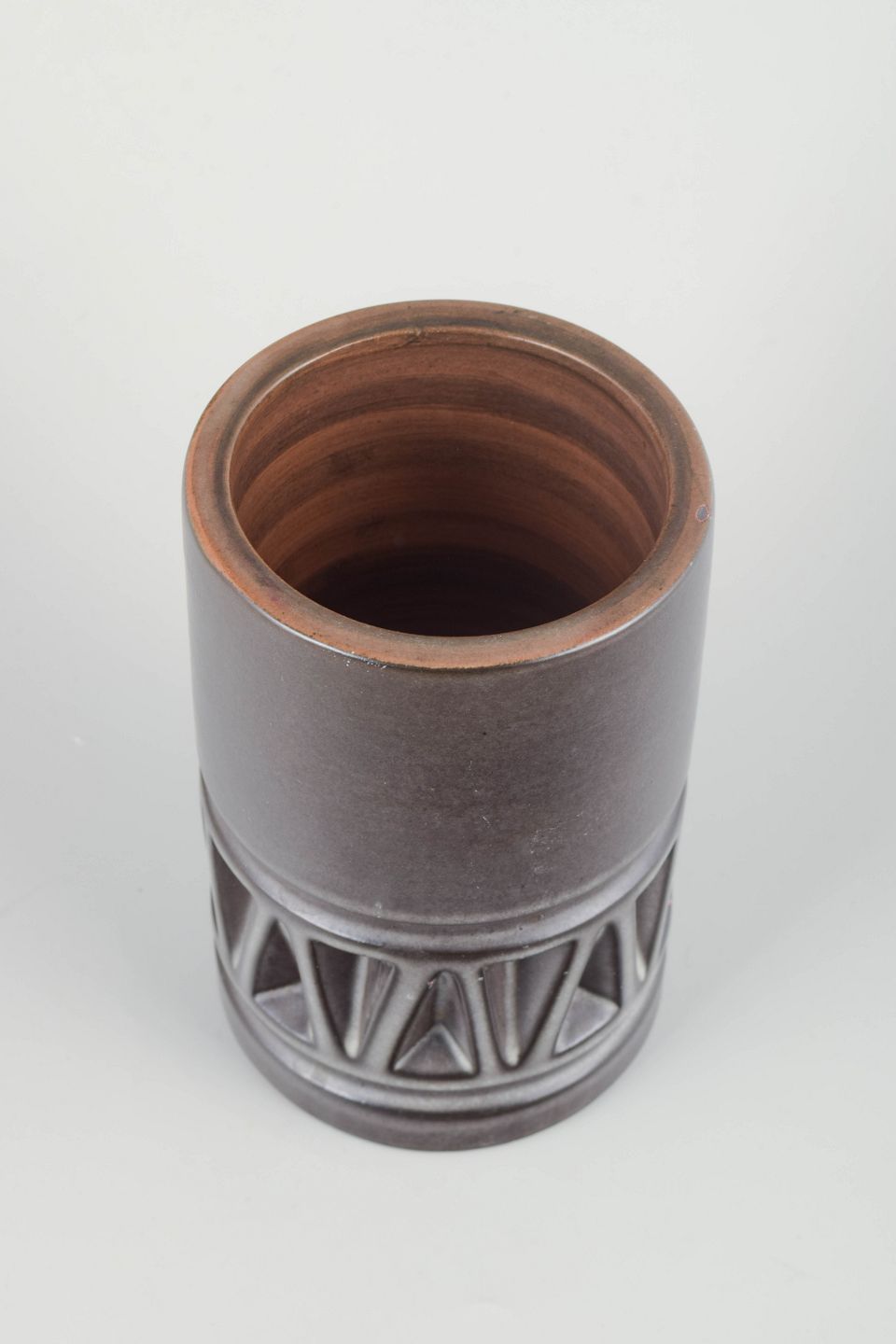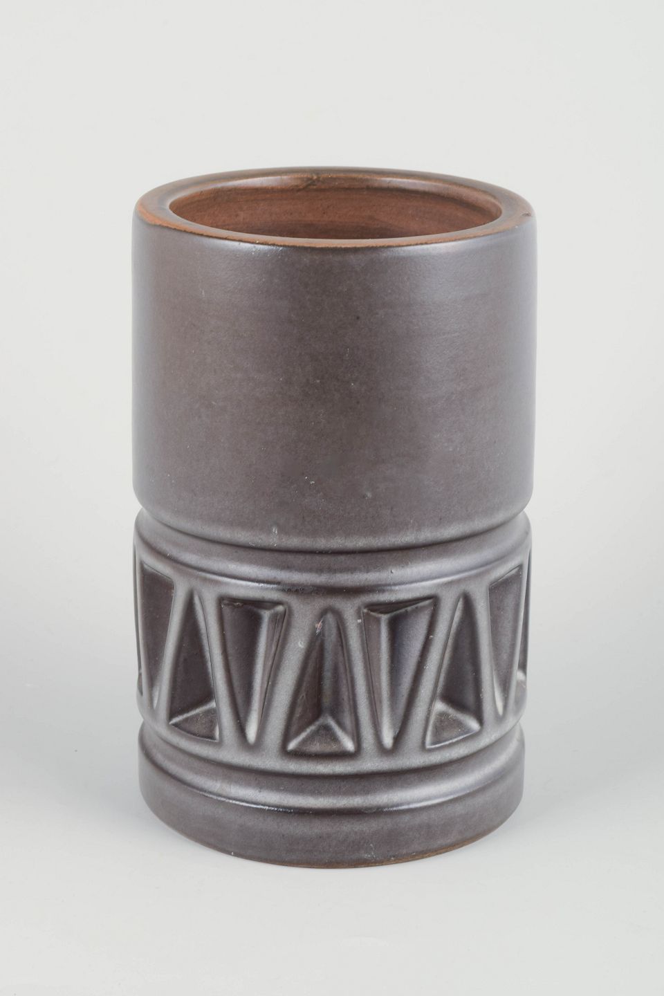 Høj cylindrisk vase i drejet stentøj med håndmalet dekor af stiliserede blomstermotiver i blå og brunlige nuancer.