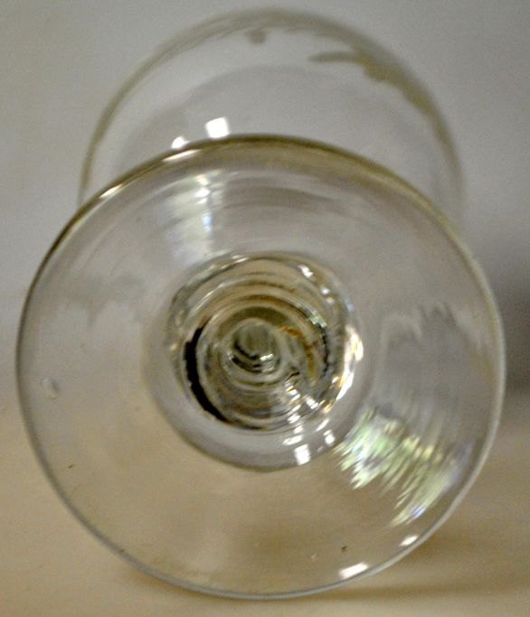 Wine glass with oak leaf cuts, 19th century. Stem with knob. Cuts with 6 leaves and 6 acorns at the top and bottom. H.: 11.2 cm.