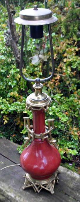 French table lamp, 19th century. Former kerosene lamp, converted to electric. Bronze and body in oxblood-colored porcelain. H.: 65 cm.Item number: 28444