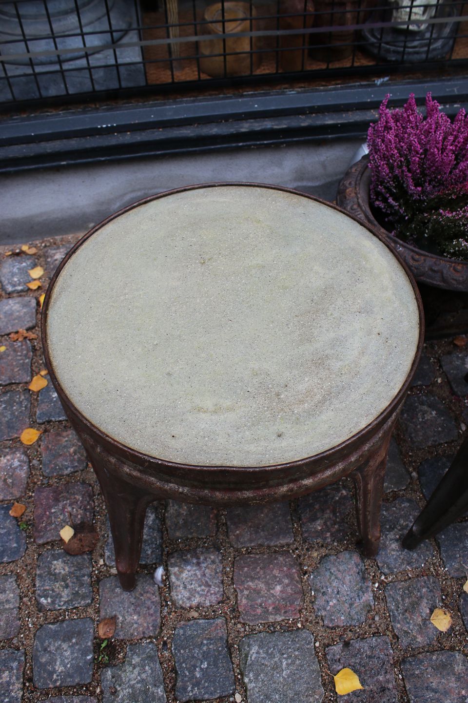 Old French Tolix coffee table / side table in polished metalfrom around 1930-40 with fantastically fine patina and with cast concrete top. H: 47cm. Dia.: 50cm.