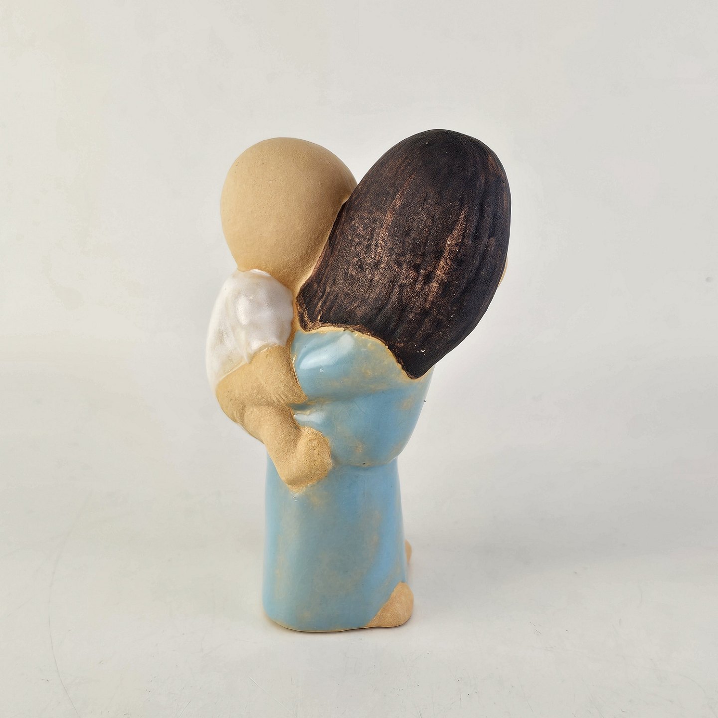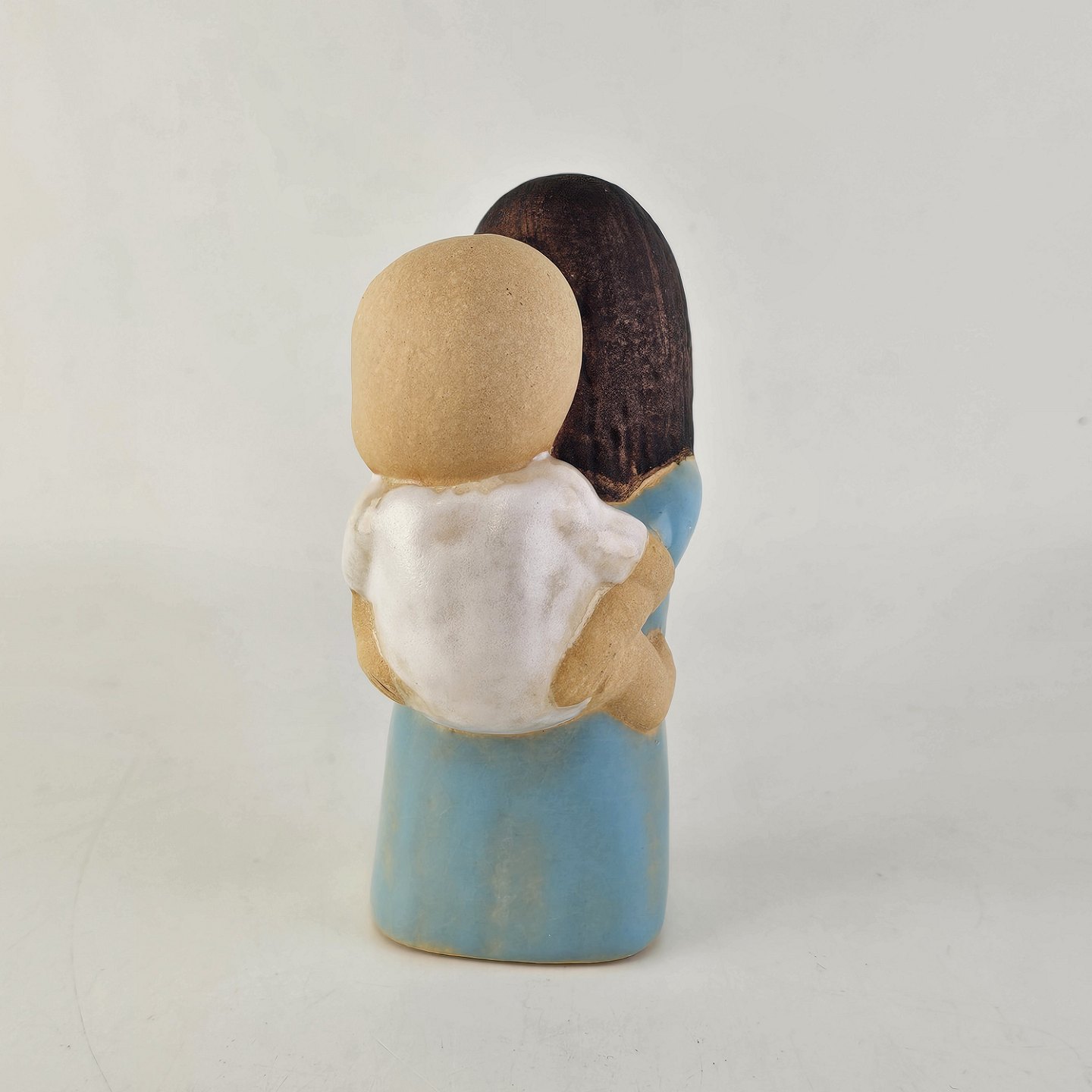 Figur i keramik med motiv af en pige med lys hud og brunt hår, som har et barn på ryggen. Figuren er fra serien Children of the World (All världens barn), designet i 1975