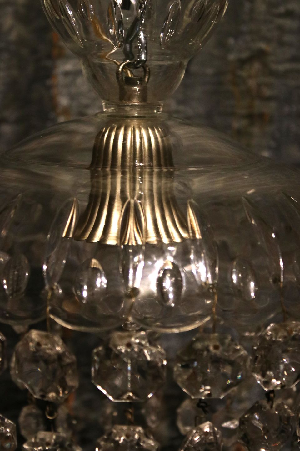 Old "bag" prism ceiling lamp with glass shade and chains with diamond cut clear glass prisms. The chandelier has one light source and measures: H: 40cm. Dia.: 25cm.Item number: Pose prisme nr.2