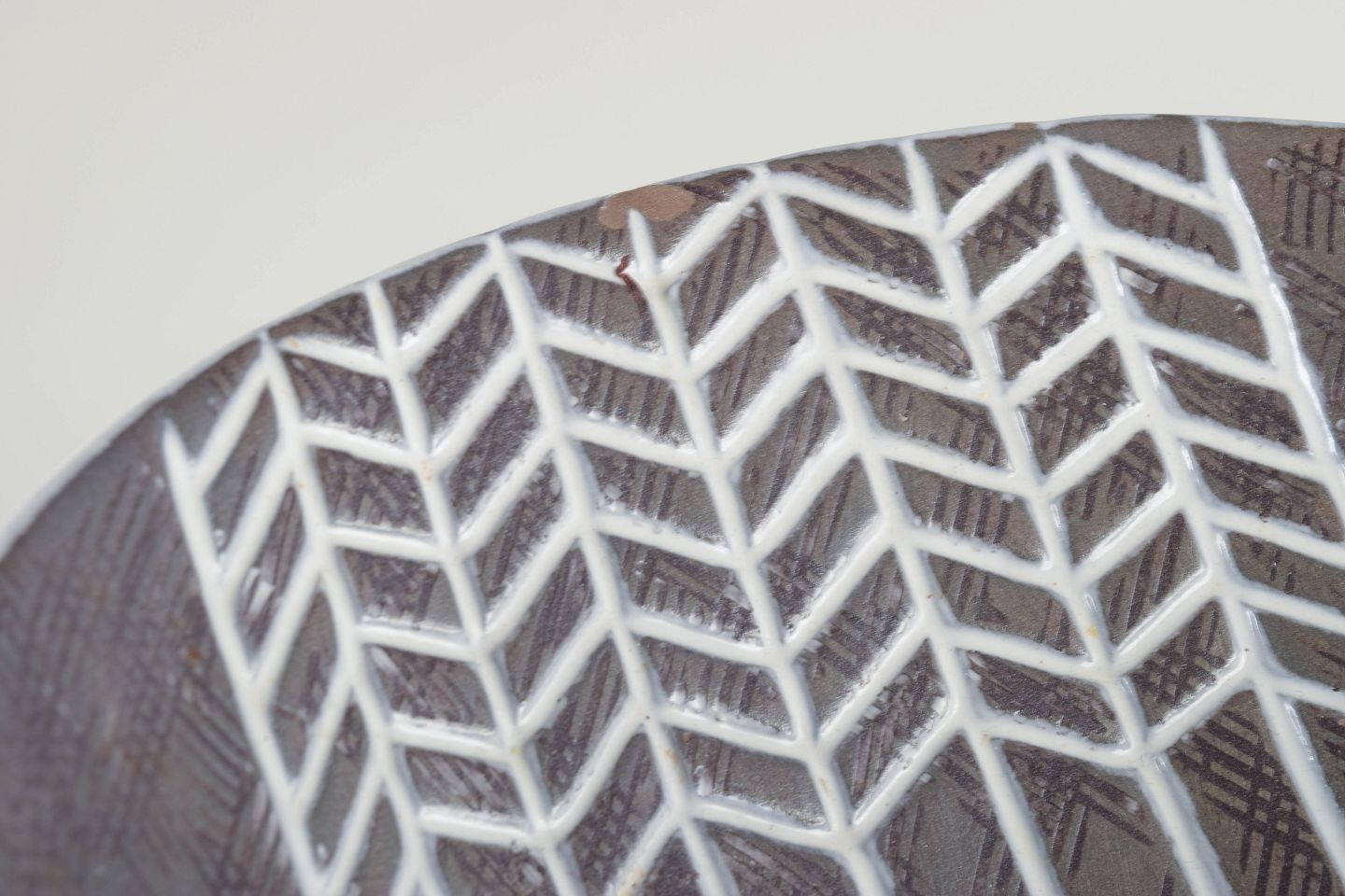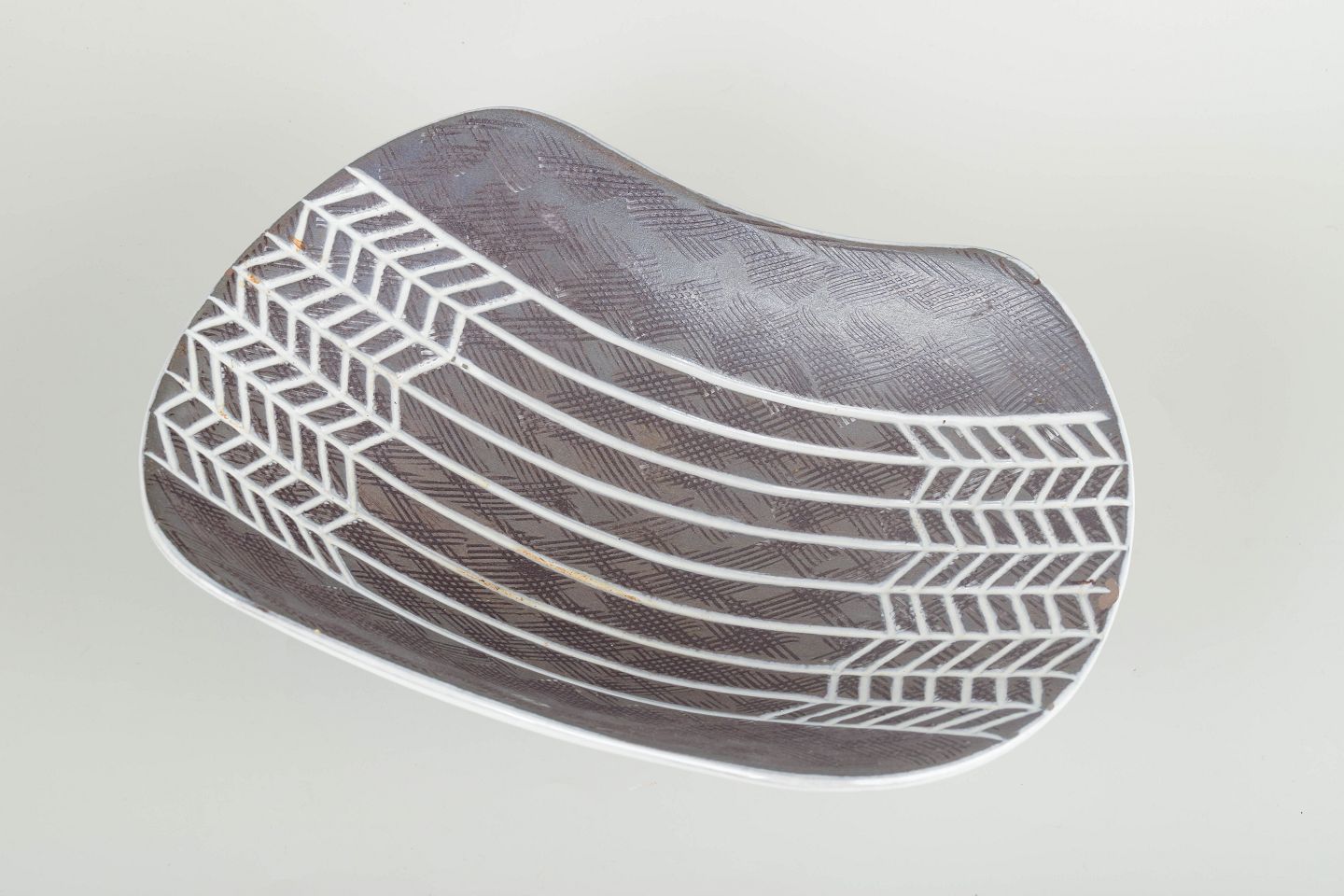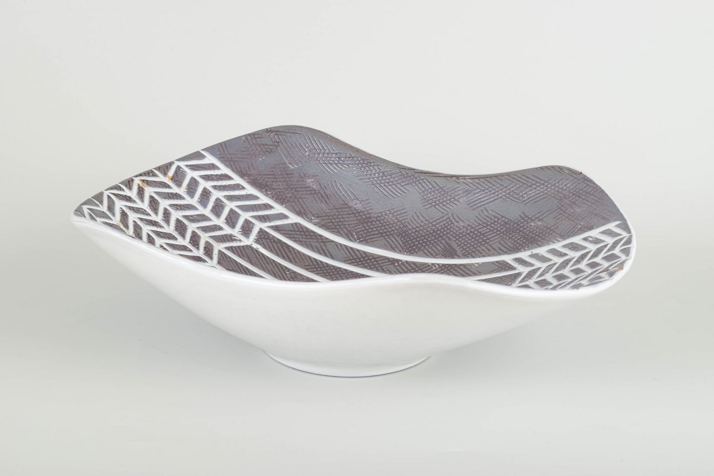 Organic form with concave sides and grey-blue incised geometric decoration.