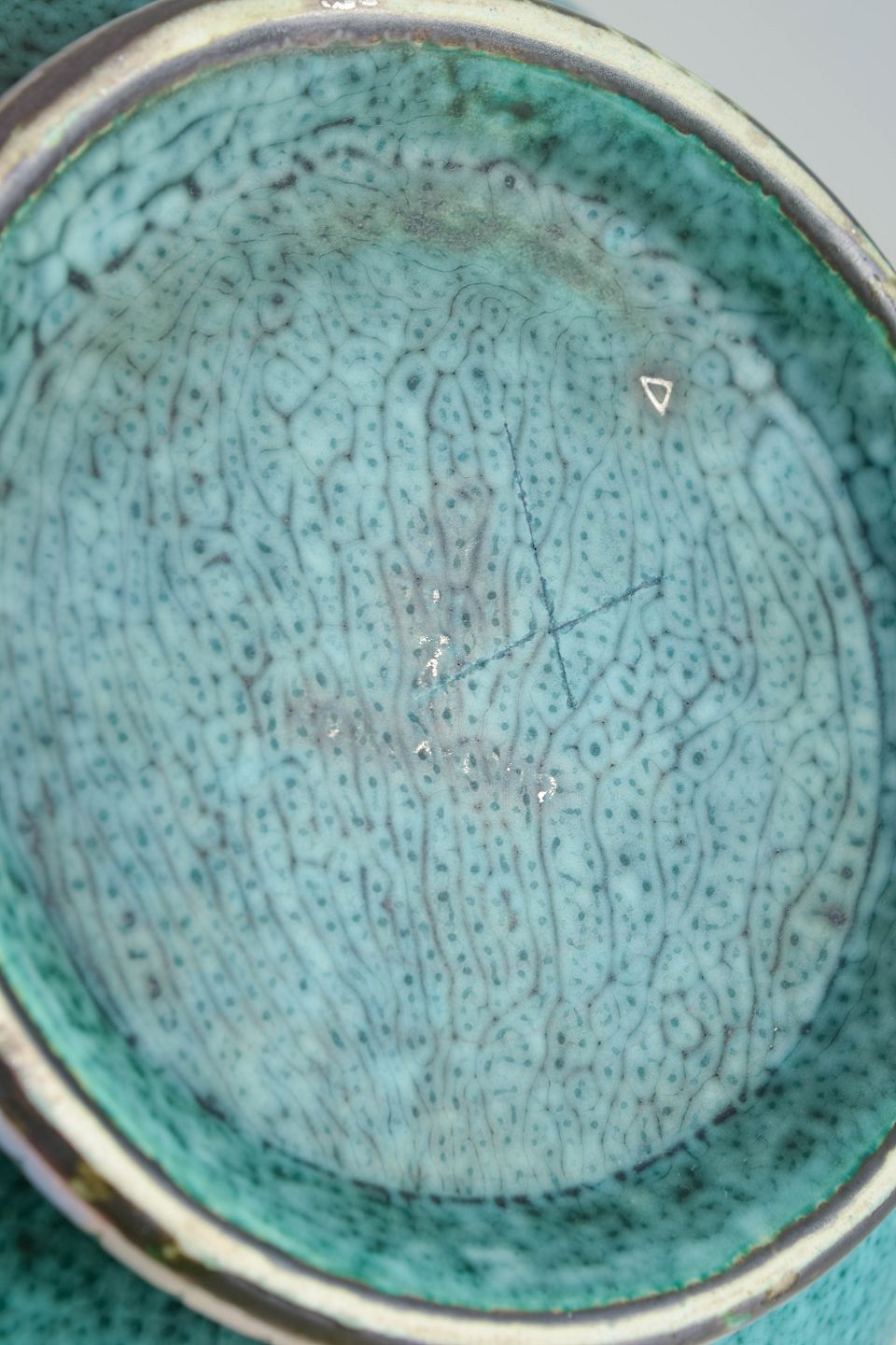 Stoneware with turquoise glaze and inlaid silver decorations, exterior featuring hand-incised female figure and stylised branch motif. Elegant scroll handles in classic Art Deco style.