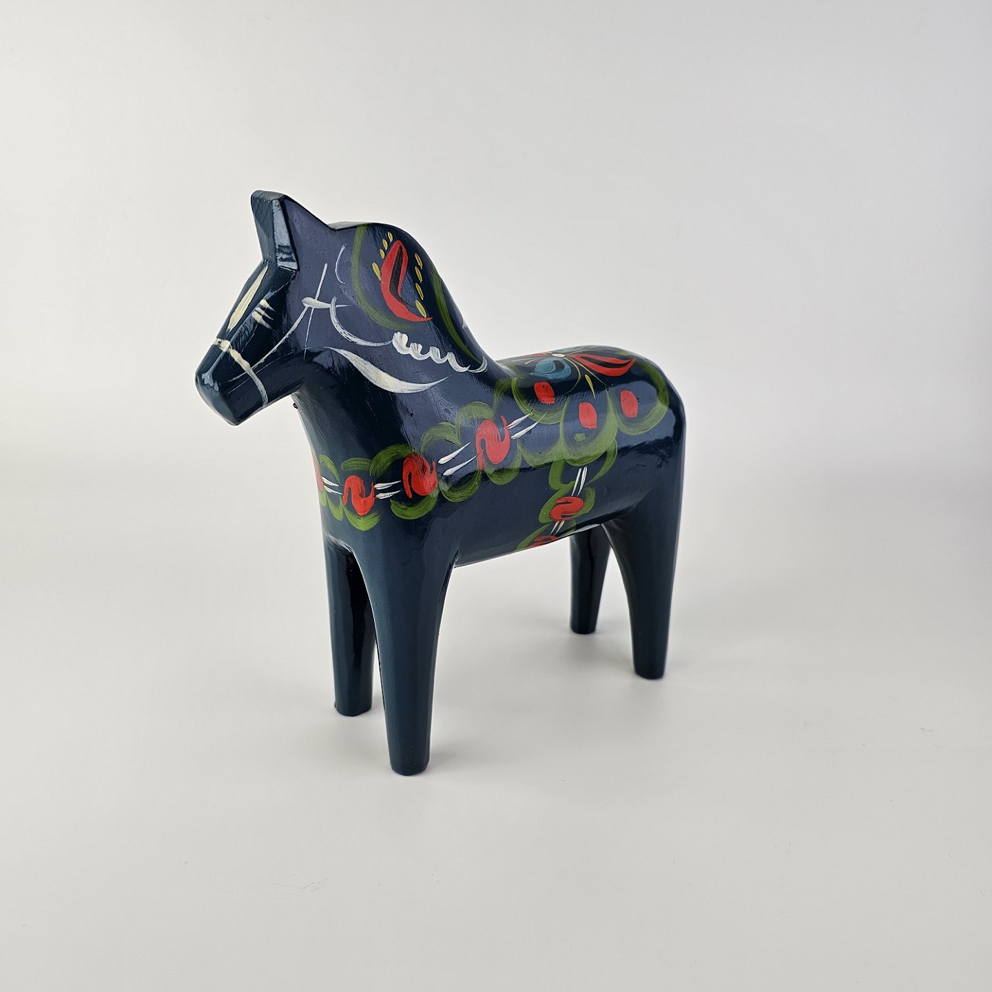 Figur af blå Dalarhest i malet og lakeret træFremstillet i Sverige
