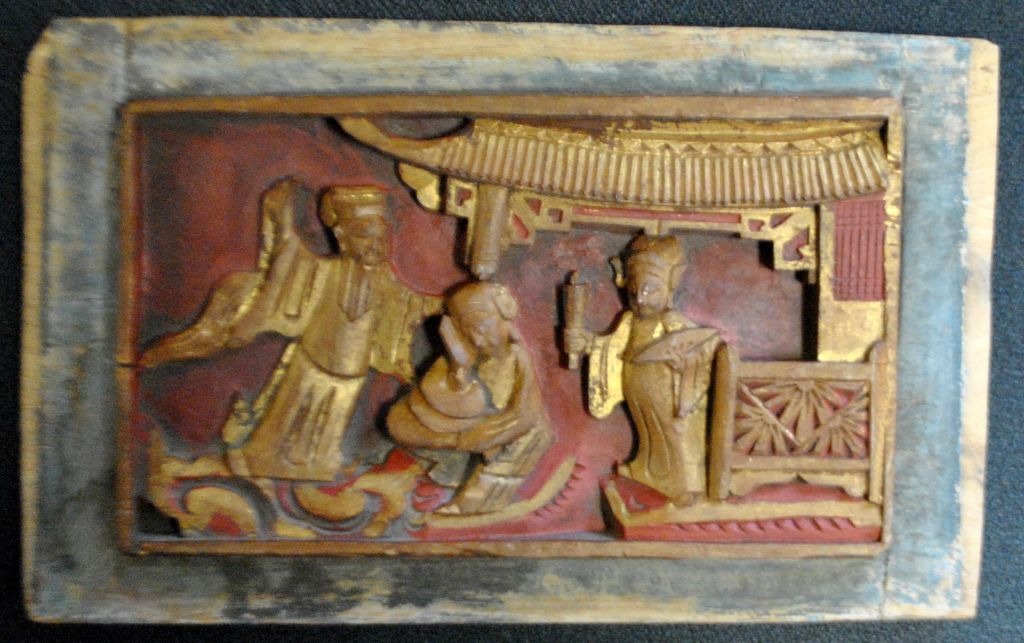 Antique Chinese painted woodcut, 19th century. With scenery with people in a temple. 15 x 24 cm.
