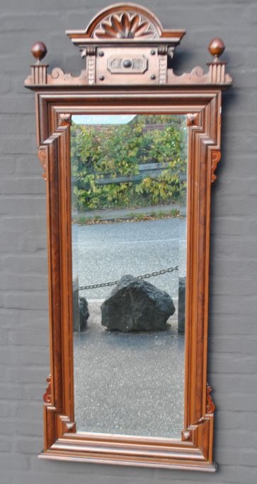 Large Danish hallway mirror, 1870-1880. Walnut and mahogany. Top with decorations and balls. Beveled mirror. H.: 159 cm. W: 67 cm.Item number: 28322