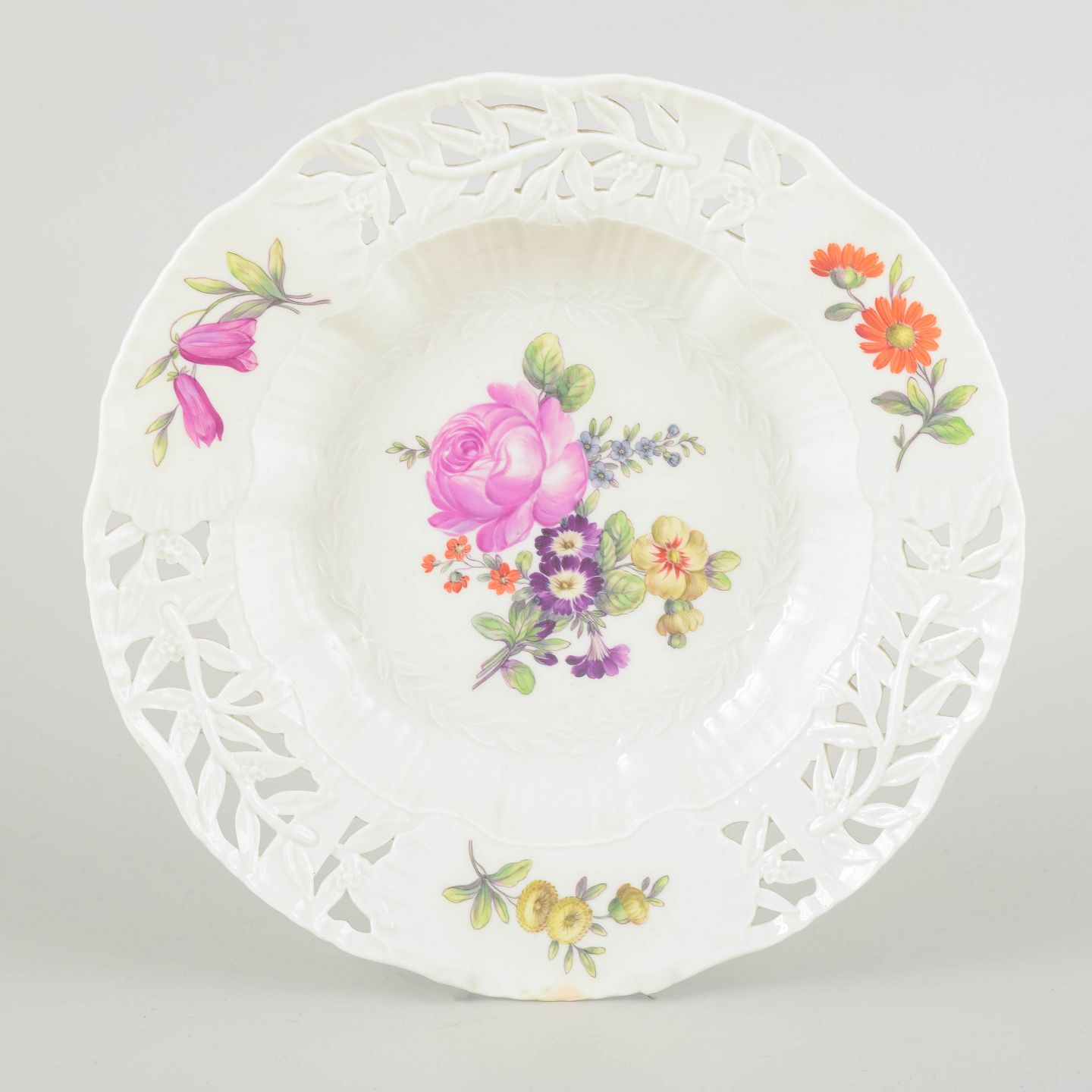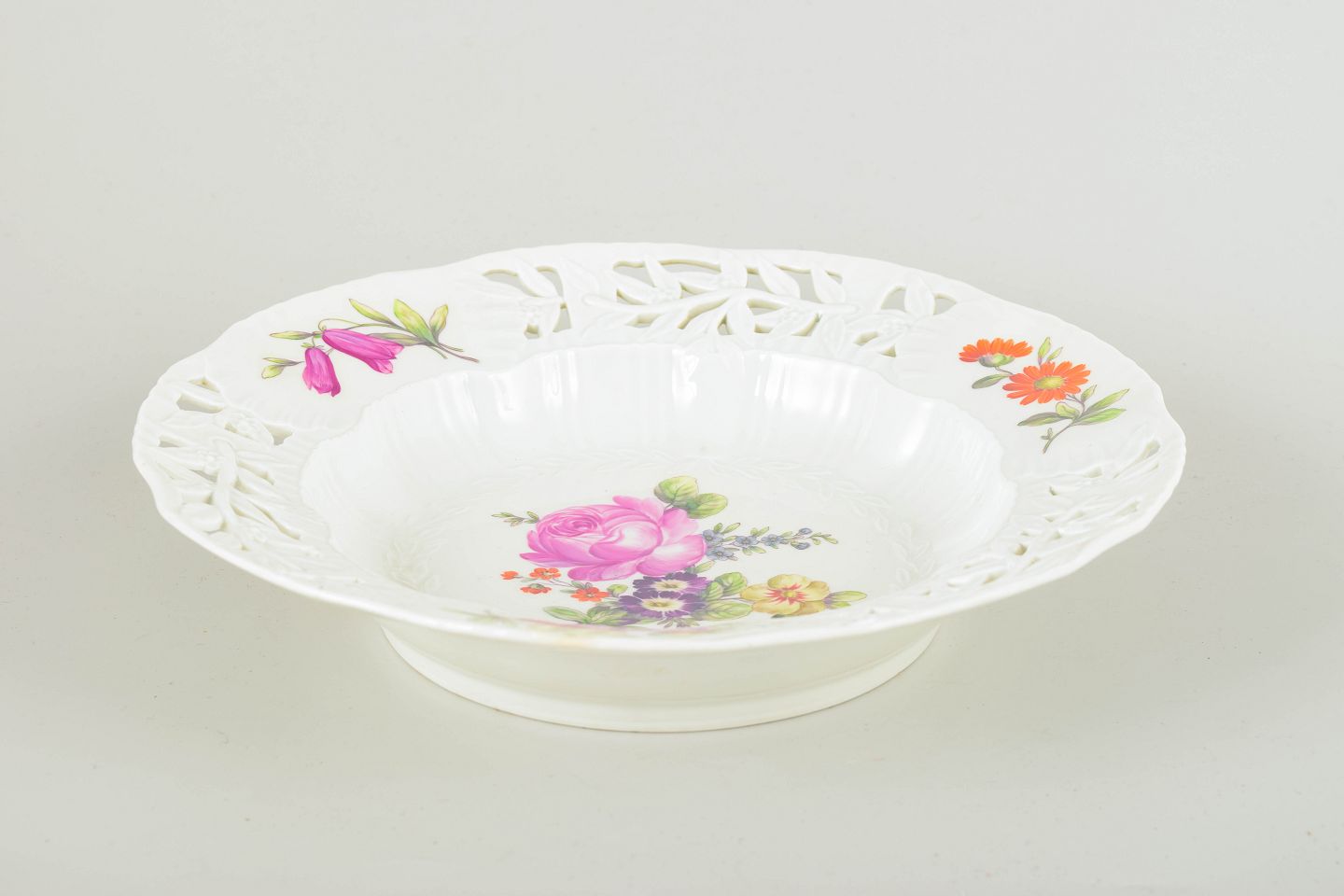 Hand-painted porcelain with floral motif in multicoloured palette and openwork rim in classic style. Elegant deep form with richly decorated centre and refined craftsmanship.