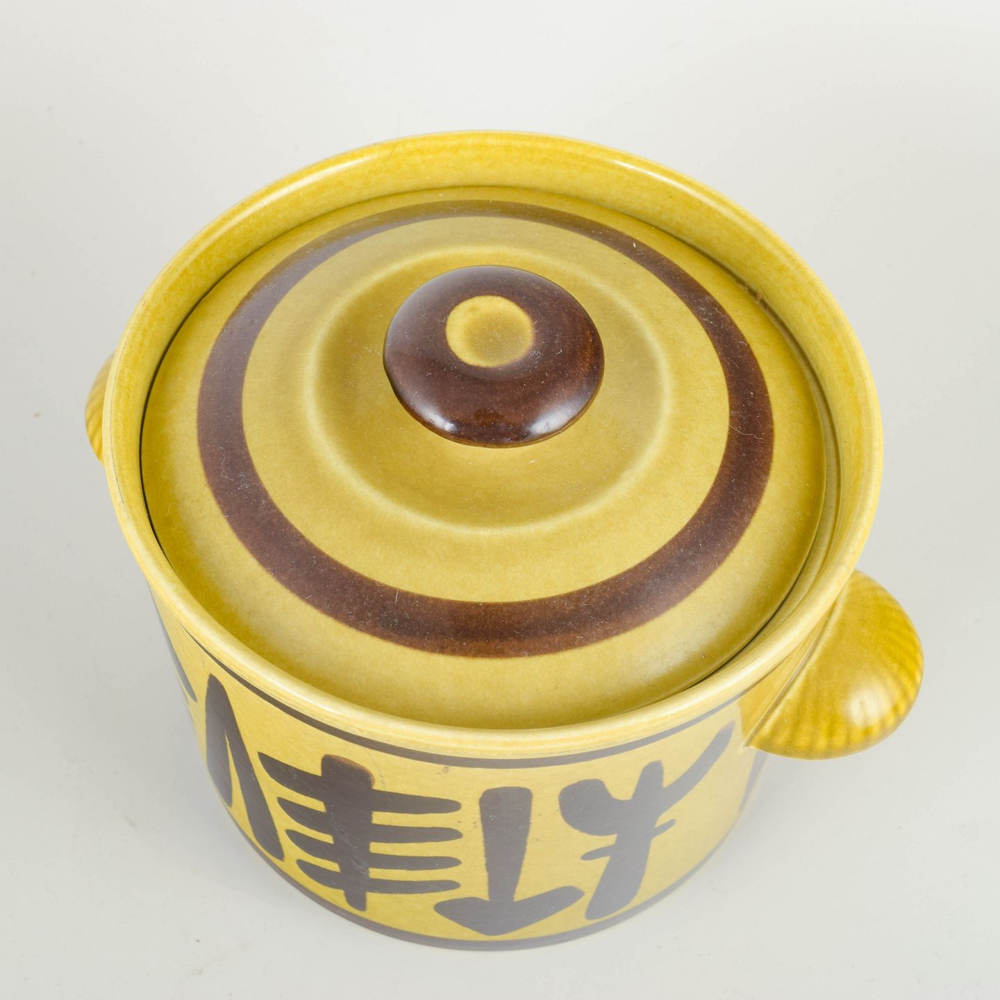 Retro lidded tureen in glazed faience with hand-painted decoration in bold yellow and brown tones, characteristic of the “Pang” series. With original side handles and lid.