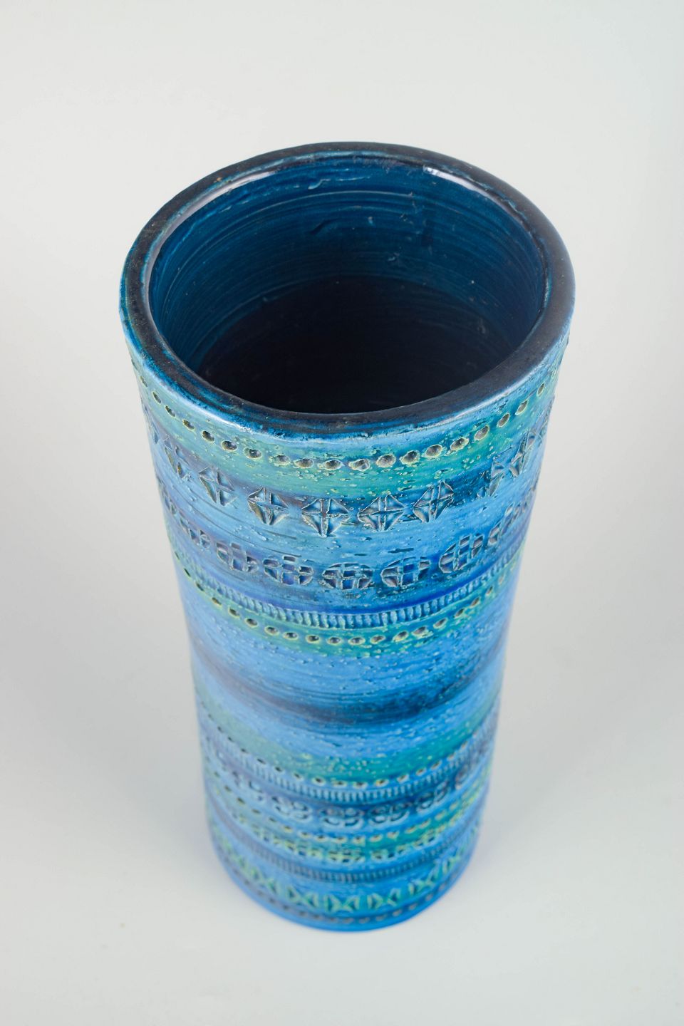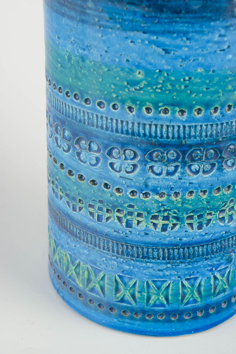 Impressive tall vase from the iconic Rimini Blu series by Bitossi, featuring hand-carved geometric motifs and a deep turquoise-blue glaze with green hues.