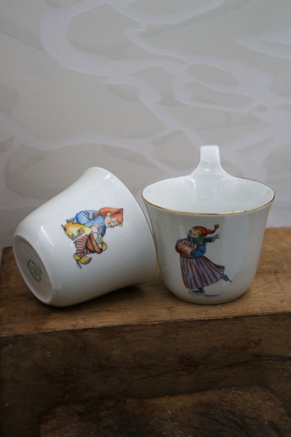 Bing & Grondahl high-handled cups with Christmas motifsand gold rim. H: 8cm. Dia.: 8.3cm.