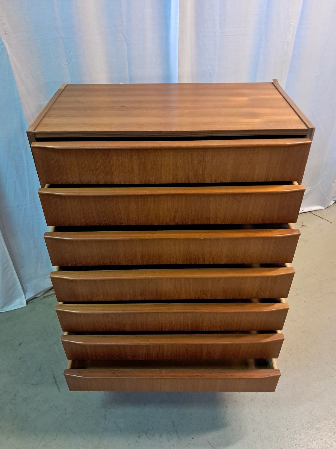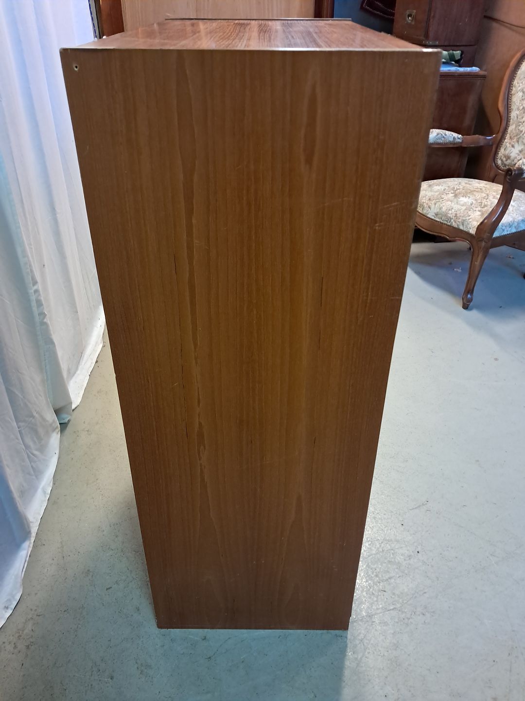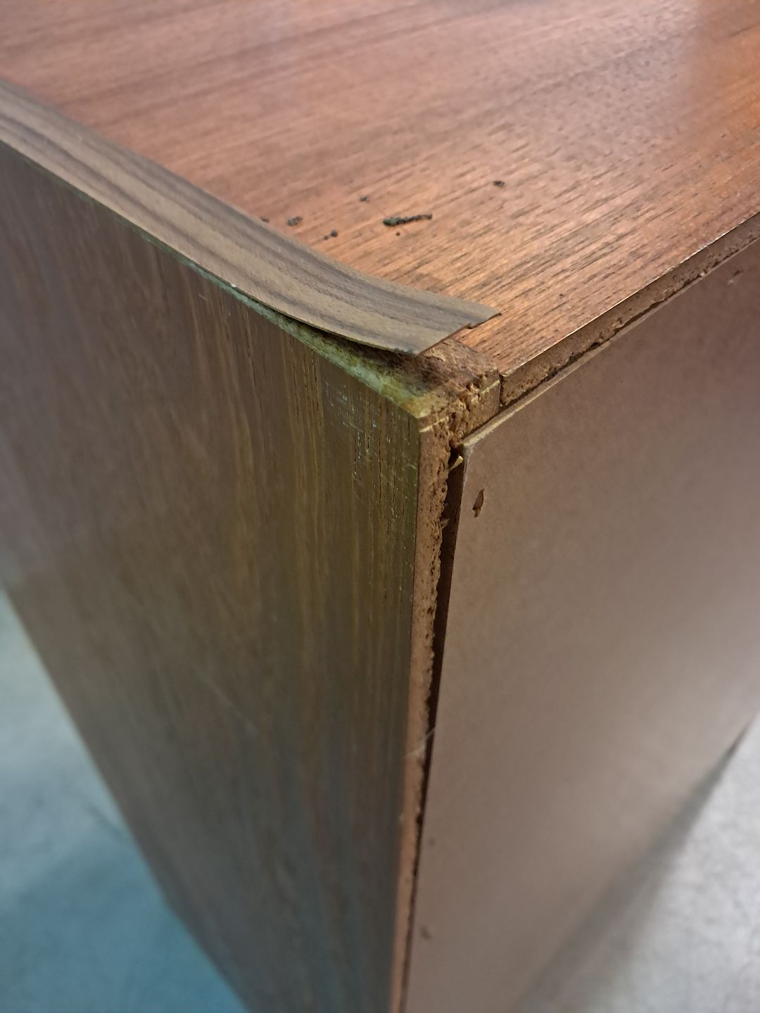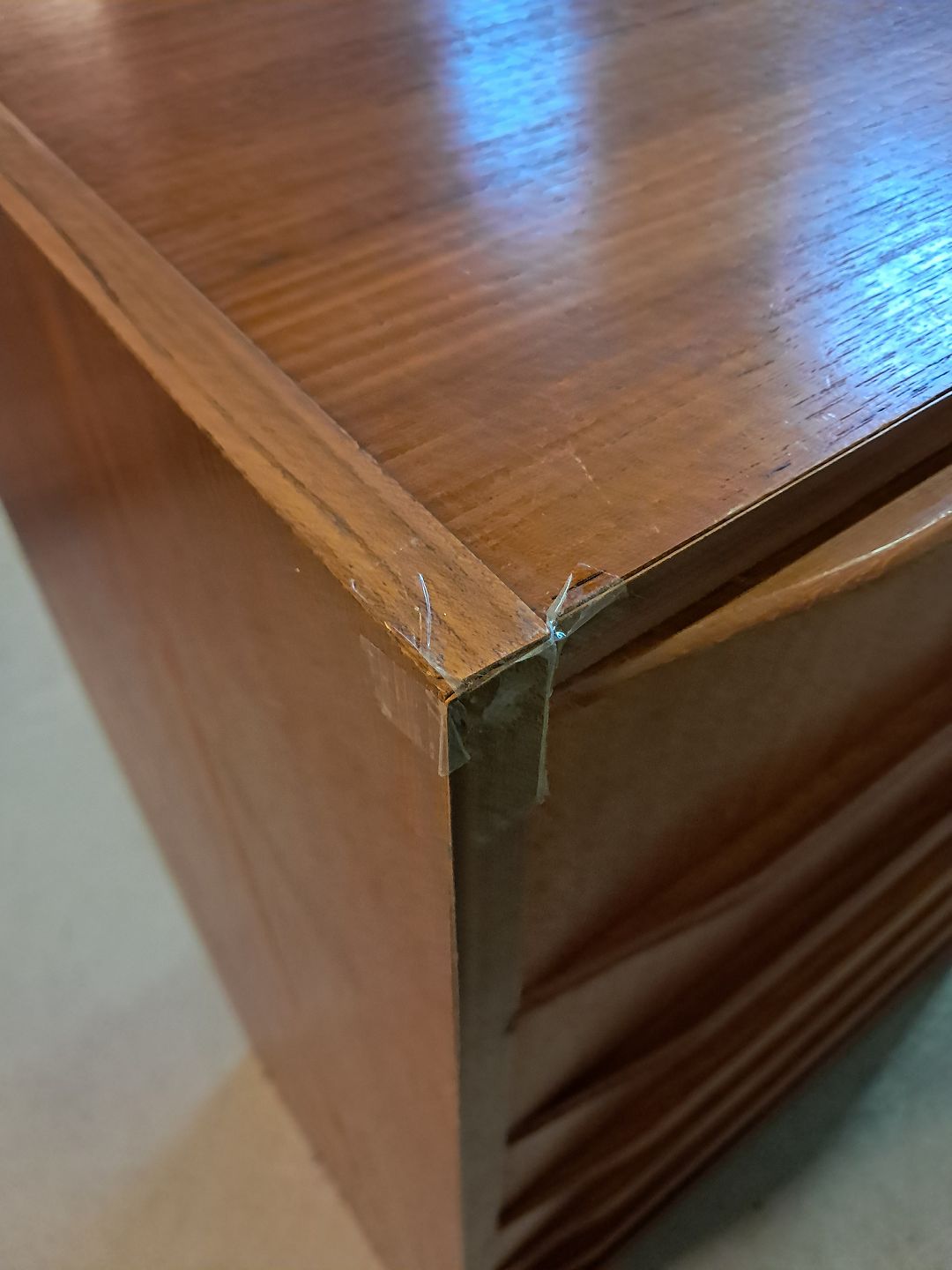 Kommode i fineret teaktræ, fra 1960erne.Den har brugsspor og defekte plast kantlister/bånd.