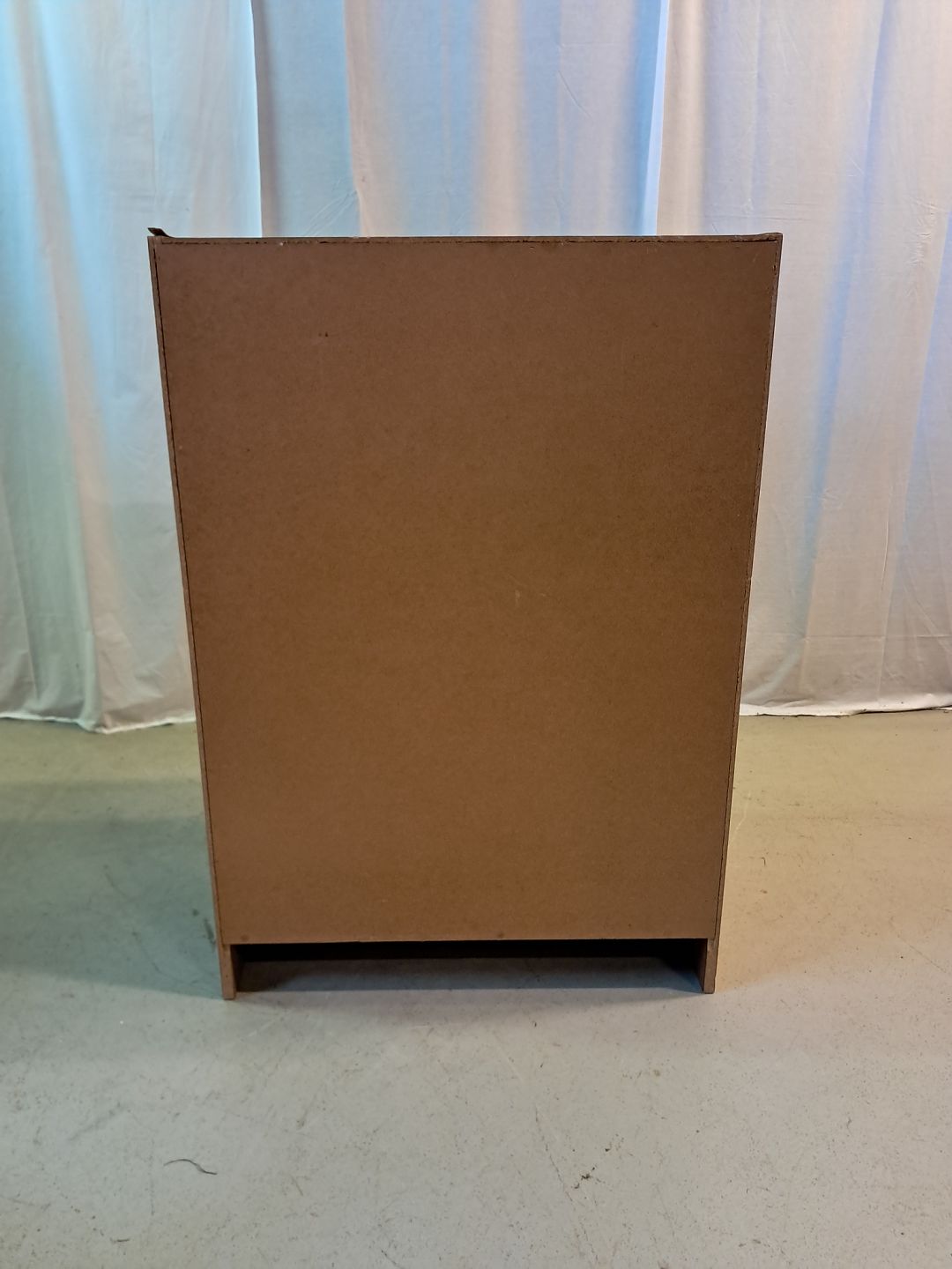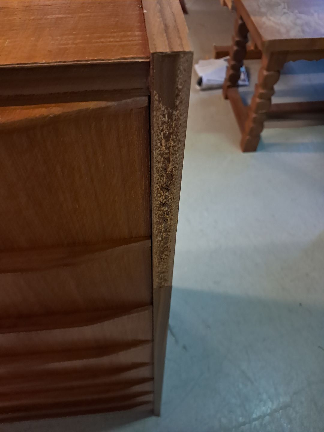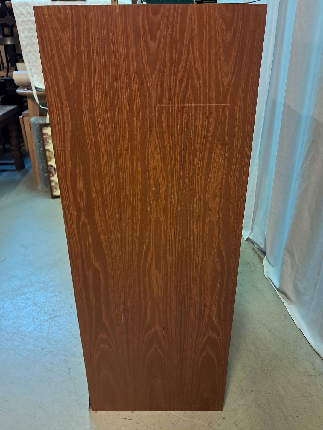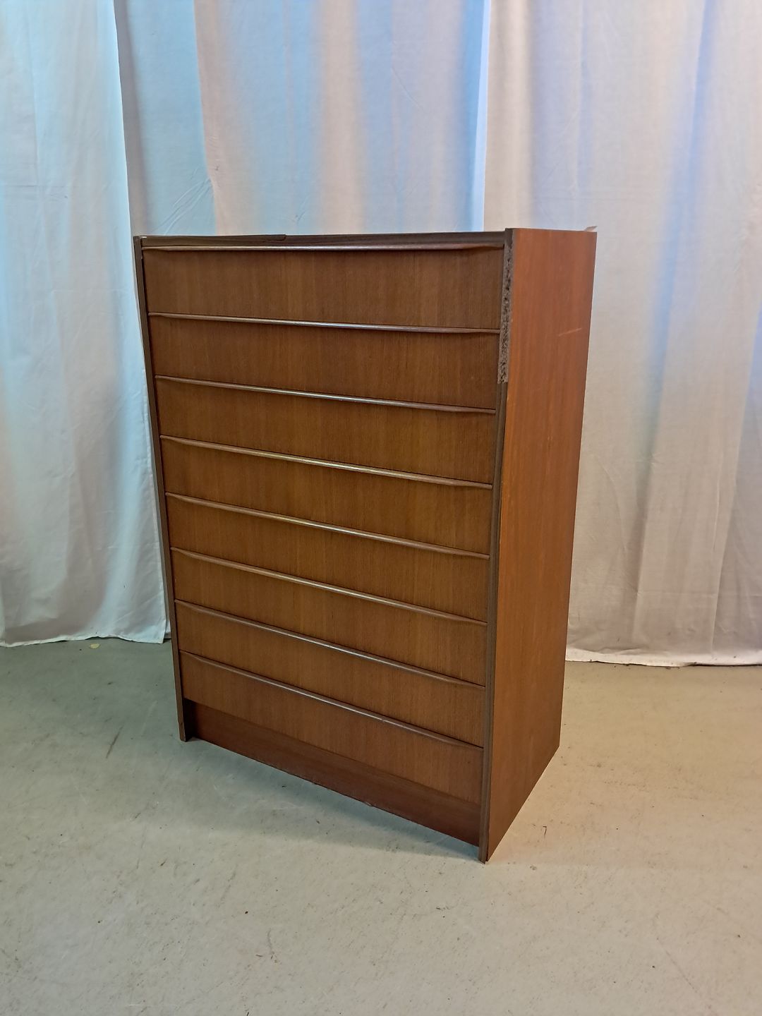 Kommode i fineret teaktræ, fra 1960erne.Den har brugsspor og defekte plast kantlister/bånd.