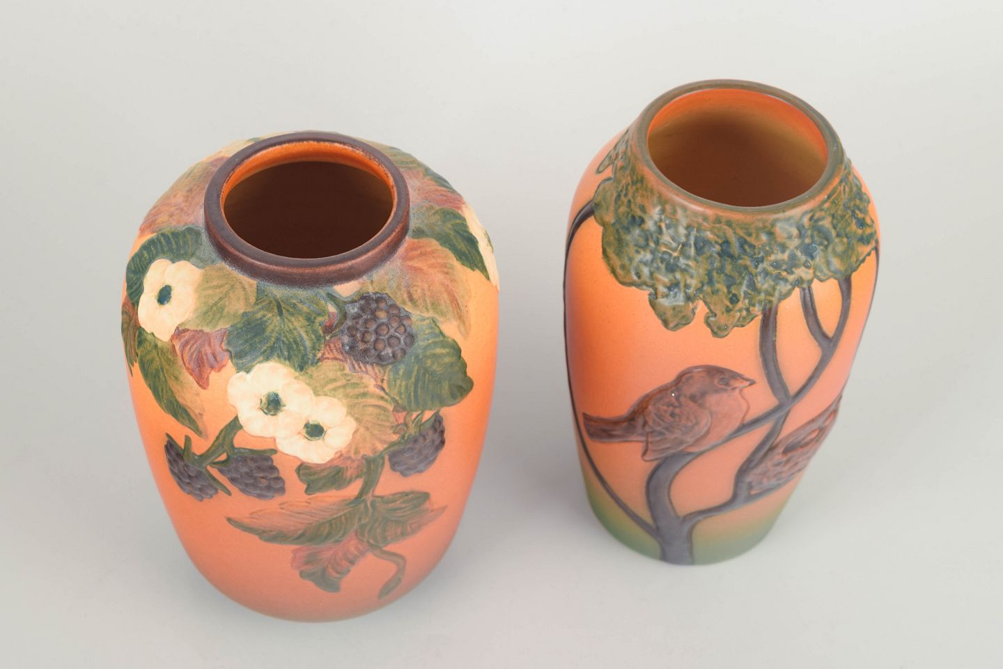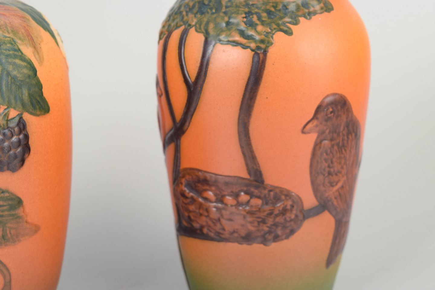 Two beautifully decorated ceramic vases by Ipsens Enke, each with relief decoration. One features blackberry branches with flowers and fruit, the other depicts a bird and nest in a tree. Both in warm orange and green tones with a matte glaze and a classic Art Deco expression.