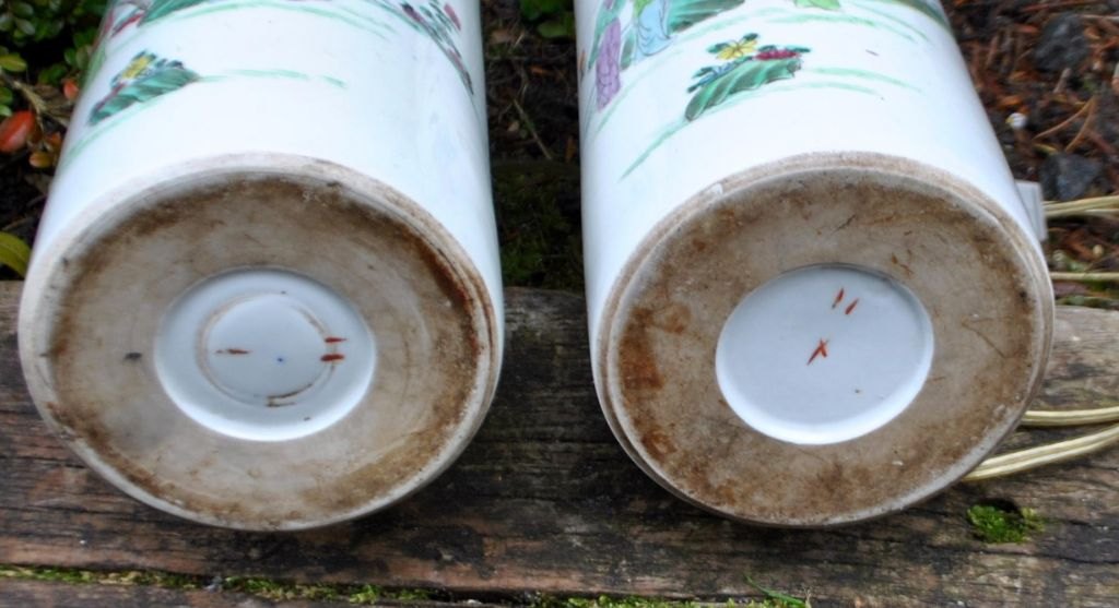 Pair of Chinese porcelain hat stands, 19th century. Converted into table lamps. Hand-painted polychrome decorations of a woman in a garden. With text in Chinese. H.: 29 cm. Height with electrical installation: 53 cm.Sold as a pair only!