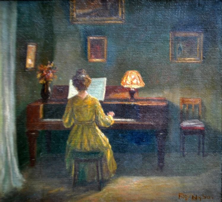 Friis Nybo, Poul (1869 - 1929) Denmark: Woman playing piano. Oil on canvas. Signed. 49 x 52 cm.Framed: 61 x 65 cm.