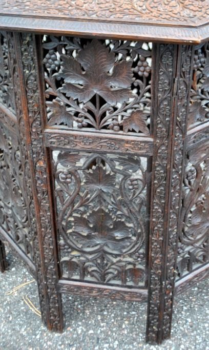Arabic octagonal smoking table with numerous carvings, 19th century. Stained wood. H.: 64 cm. W.: 60 cm.Item number: 28340