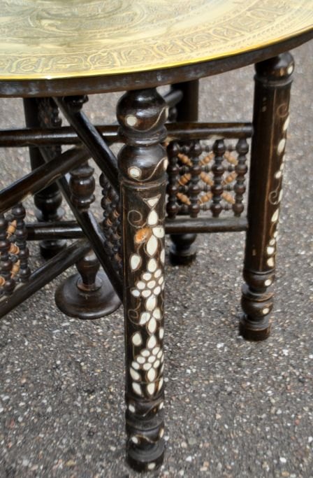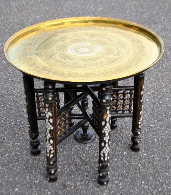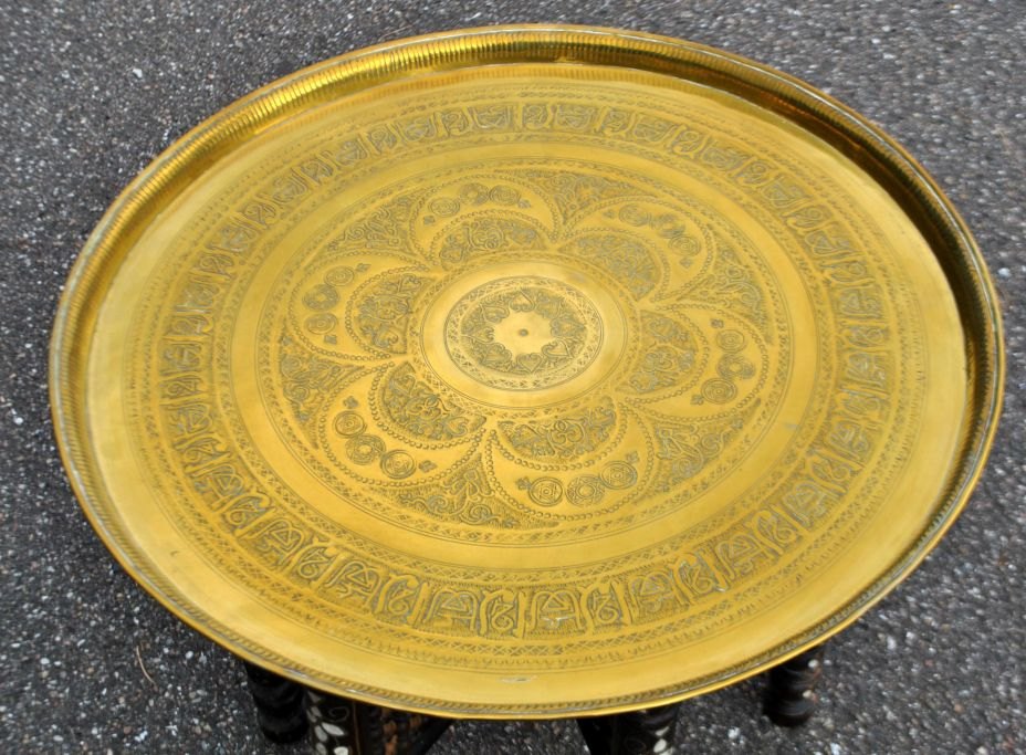Arabic smoking table with brass plate, 19th/20th century. Brass plate decorated with patterns. Wooden base with inlaid mother of pearl. H.: 49 cm. Dia.: 59 cm.Item number: 28341