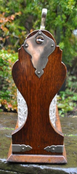 English tantalus with three crystal decanters, 19th century. Polished oak. With brass fittings and lock with key. H: 32.5 cm. L: 35 cm.NB: carafes have a few chips.