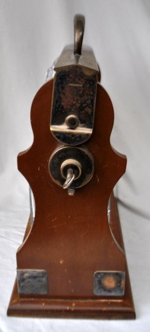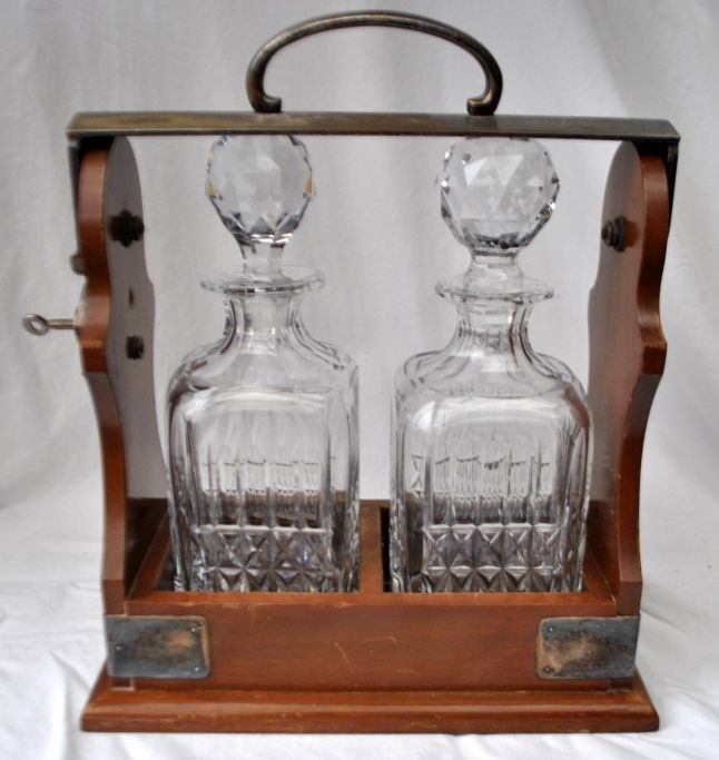 English tantalus with two crystal decanters, 19th century. With metal fittings and lock with key. Stamped. H: 32 cm. L: 27 cm.Item number: 28481