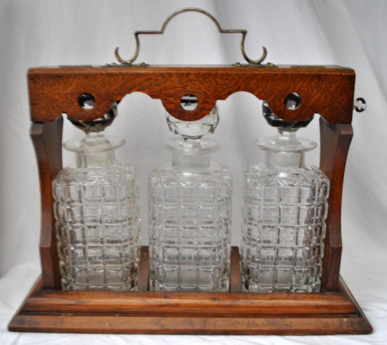 English tantalus with three crystal decanters, 19th century. Oak. With brass fittings and lock with key. H: 33 cm. L: 37 cm.Item number: 28482