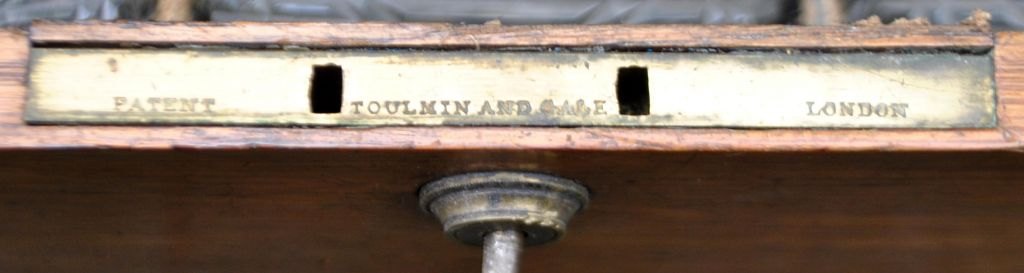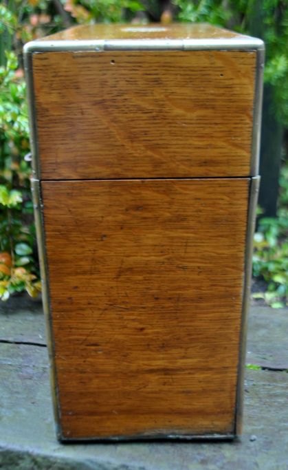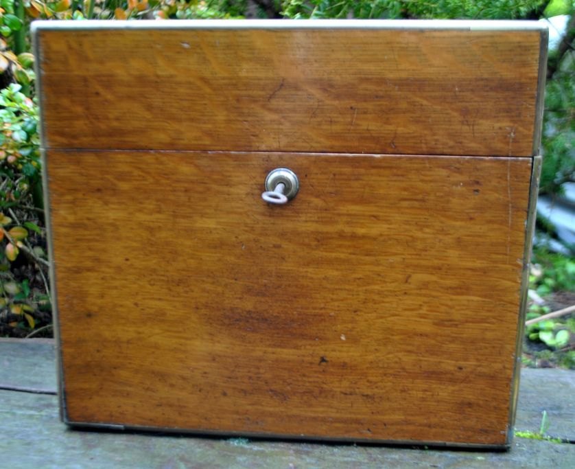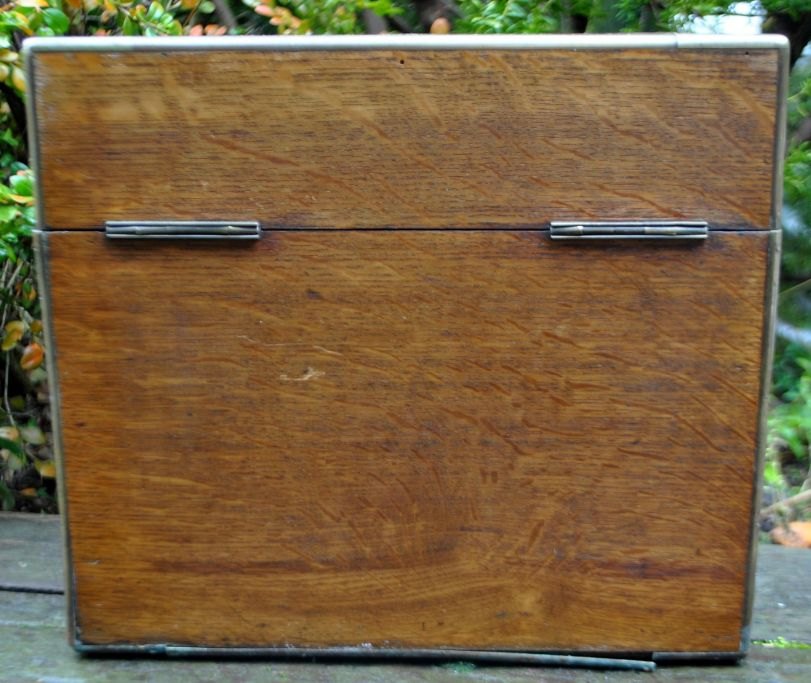 English tantalus with three crystal decanters, 19th century. Polished oak box with lock and key plate. Containing three decanters with stopper. Stamped. H: 27 cm. L: 30 cm.Item number: 28485