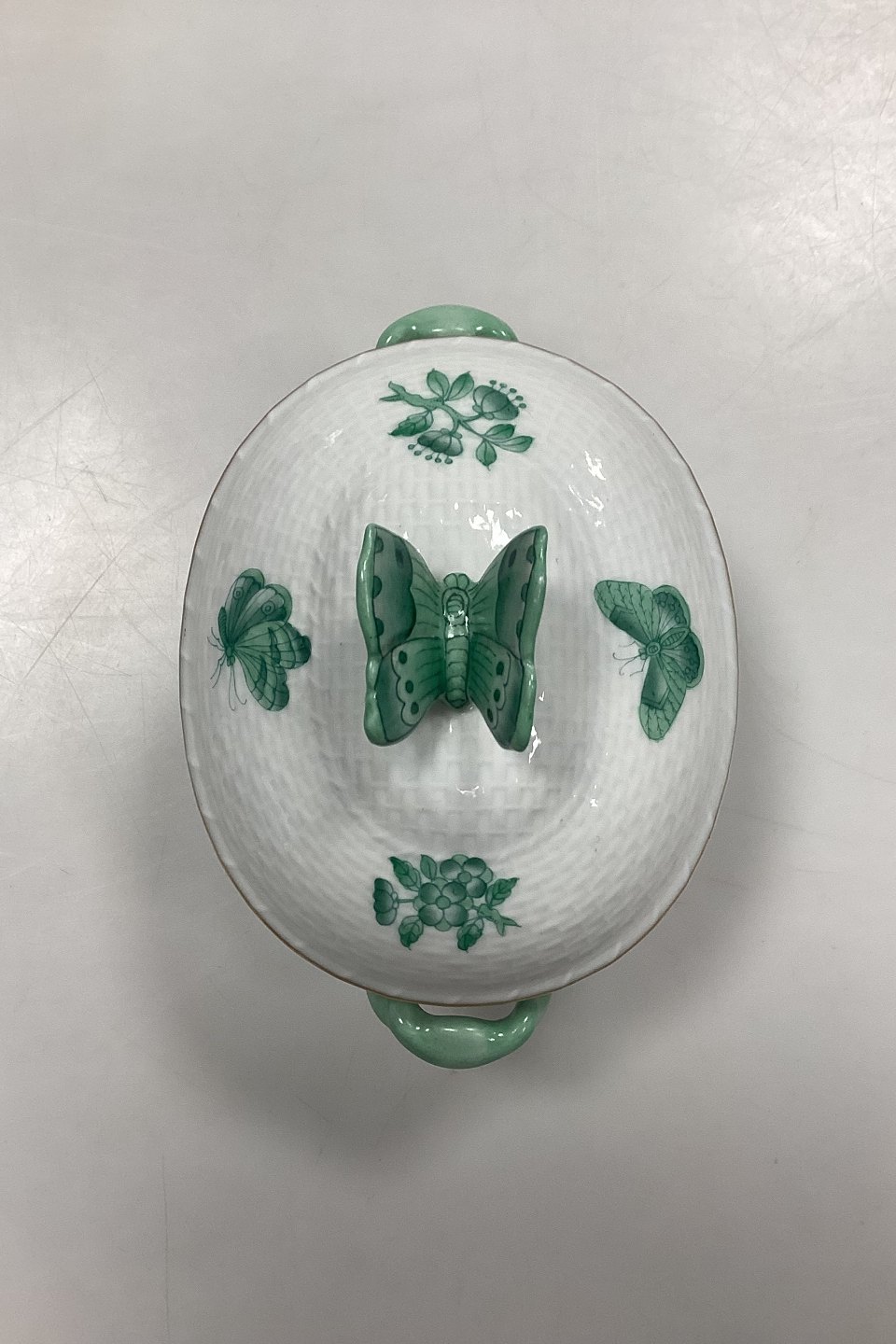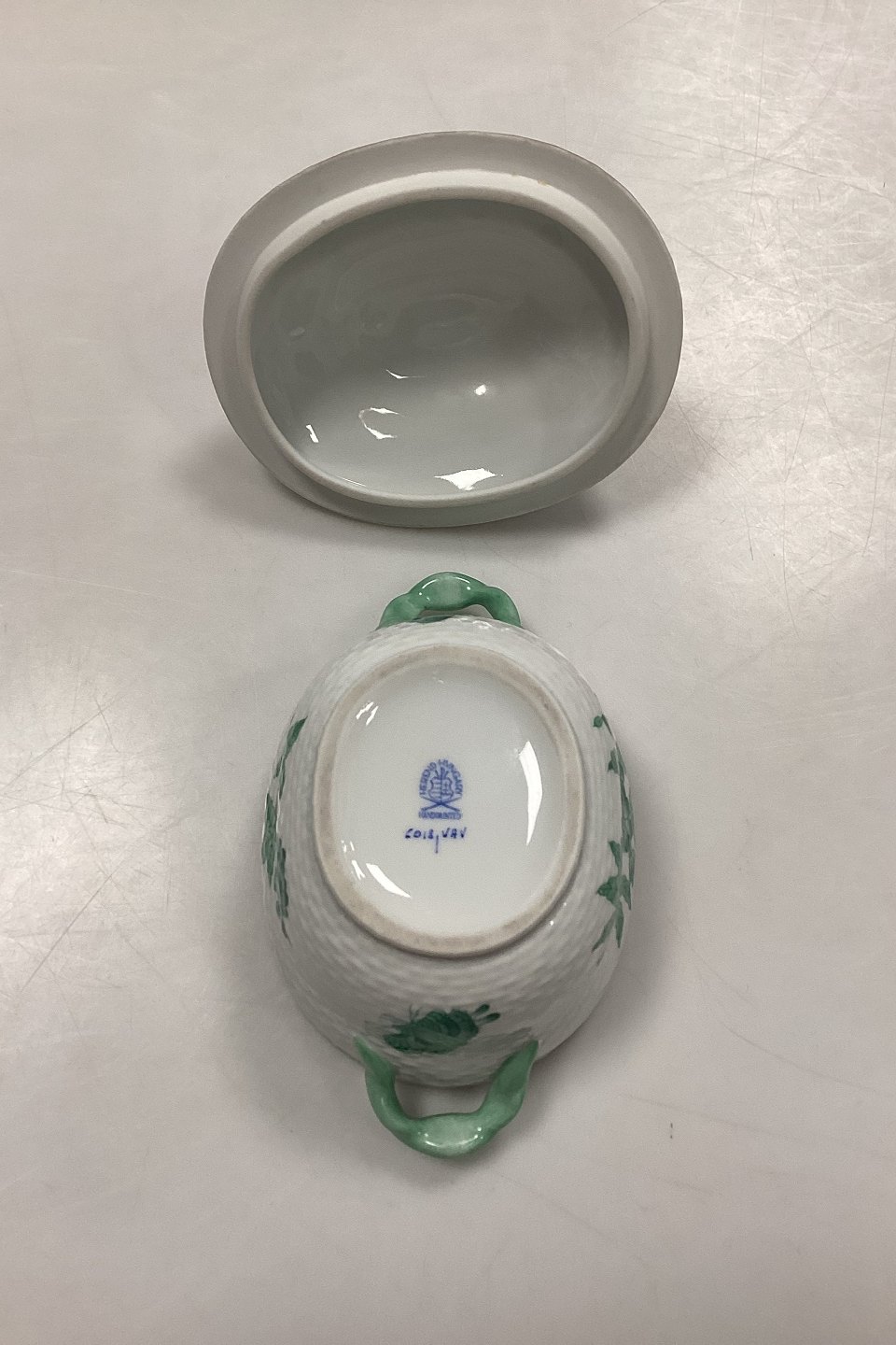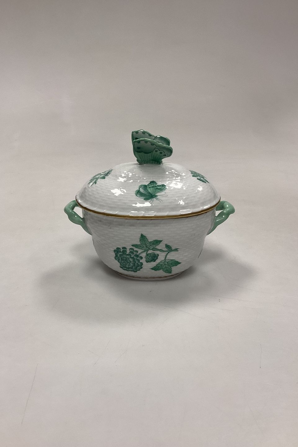 Herend Chinese Bouquet Green Lidded Bowl No. 6018/VAV. Measures 11 cm / 4.33 in. with butterfly x 13.5 cm / 5.31 in. with handle.Stock: 1