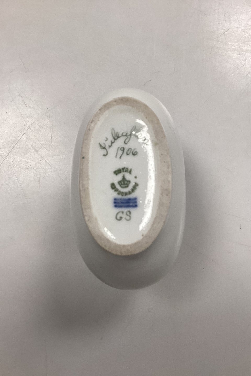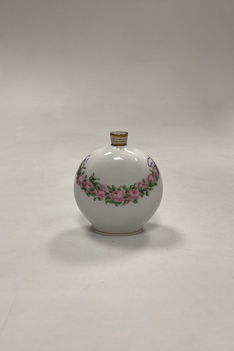 Royal Copenhagen Privately Painted Vase. Motif with pink rose garland. Inscription at the bottom: Christmas Eve 1906, GS. Measures 10 cm / 3.93 in.Stock: 1