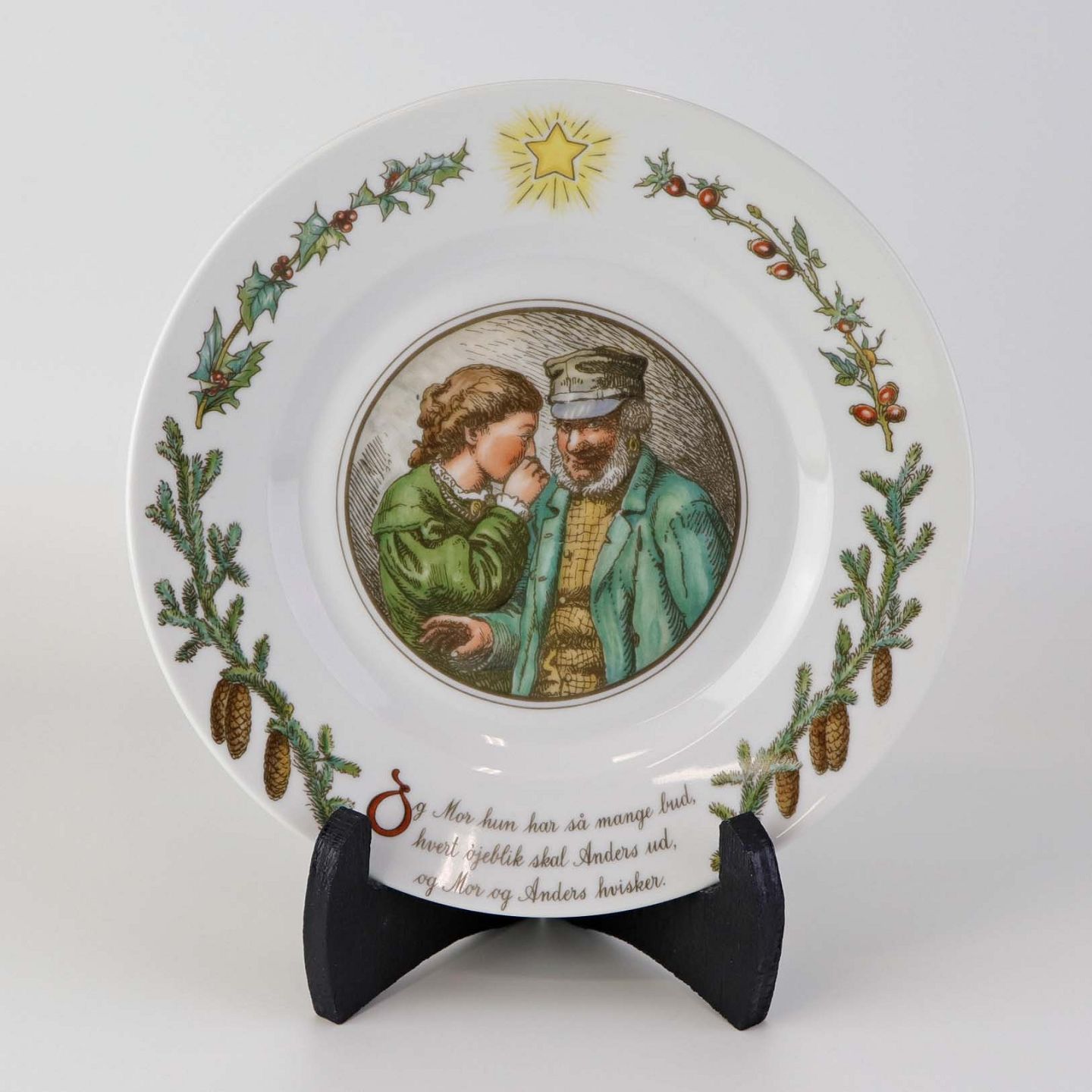 Teksten på tallerknen lyder - Og mor hun har så mange bud, hvert øjeblik skal Anders ud, og mor og Anders hvisker.